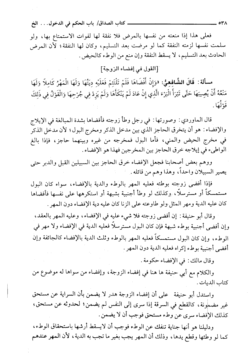 وَالْكَلَامُ مَعَ أَبِي حَنِيفَةَ هَاهُنَا فِي إِفْضَاءِ الزَّوْجَةِ، وَإِفْضَاءُ مَنْ سِوَاهَا لَهُ مَوْضُوعٌ مِنْ كِتَابِ الدِّيَاتِ.