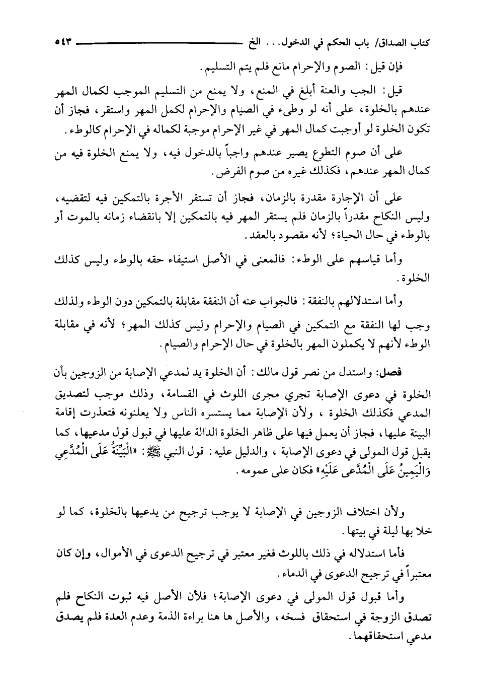 وَاسْتَدَلَّ مَنْ نَصَرَ قَوْلَ مَالِكٍ: أَنَّ الْخَلْوَةَ يَدٌ لِمُدَّعِي الْإِصَابَةِ مِنَ الزَّوْجَيْنِ بِأَنَّ الْخَلْوَةَ فِي دَعْوَى الْإِصَابَةِ تَجْرِي مَجْرَى اللَّوْثِ فِي الْقَسَامَةِ، وَذَلِكَ مُوجِبٌ لِتَصْدِيقِ الْمُدَّعِي فَكَذَلِكَ الْخَلْوَةُ، وَلِأَنَّ الْإِصَابَةَ مِمَّا يَسْتَسِرُّهُ النَّاسُ وَلَا يُعْلِنُونَهُ فَتَعَذَّرَتْ إِقَامَةُ الْبَيِّنَةِ عَلَيْهَا، فَجَازَ أَنْ يُعْمَلَ فِيهَا عَلَى ظَاهِرِ الْخَلْوَةِ الدَّالَّةِ عَلَيْهَا فِي قَبُولِ قَوْلِ مُدَّعِيهَا، كَمَا يُقْبَلُ قَوْلُ الْمَوْلَى فِي دَعْوَى الْإِصَابَةِ، وَالدَّلِيلُ عَلَيْهِ: قَوْلُ النَّبِيِّ - صَلَّى اللَّهُ عَلَيْهِ وَسَلَّم َ -: " الْبَيِّنَةَ عَلَى الْمُدَّعِي وَالْيَمِينَ عَلَى الْمُدَّعَى عَلَيْهِ " فَكَانَ عَلَى عُمُومِهِ.