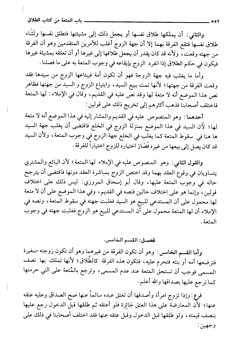 وَالثَّانِي: أَنْ يُمَلِّكَهَا طَلَاقَ نَفْسِهَا أَوْ يَجْعَلَ ذَلِكَ إِلَى مَشِيئَتِهَا فَتُطَلِّقُ نَفْسَهَا وَتَشَاءُ طَلَاقَ نَفْسِهَا فَتَقَعُ الْفُرْقَةُ بِهِمَا إِلَّا أَنَّ جِهَةَ الزَّوْجِ أَغْلَبُ لِلْأَمْرَيْنِ الْمُتَقَدِّمَيْنِ وَهُوَ أَنَّ الْفُرْقَةَ مِنْ جِهَتِهِ وَقَعَتْ، وَلِأَنَّهُ قَدْ كَانَ يَقْدِرُ أَنْ يَجْعَلَ طَلَاقَهَا إِلَى غَيْرِهَا أَوْ أَنْ تُعَلِّقَهُ بِمَشِيئَةِ غَيْرِهَا فَيَكُونُ فِي حُكْمِ الطَّلَاقِ إِذَا انْفَرَدَ الزَّوْجُ بِإِيقَاعِهِ فِي وُجُوبِ الْمُتْعَةِ بِهِ عَلَى مَا فَصَّلْنَا.
