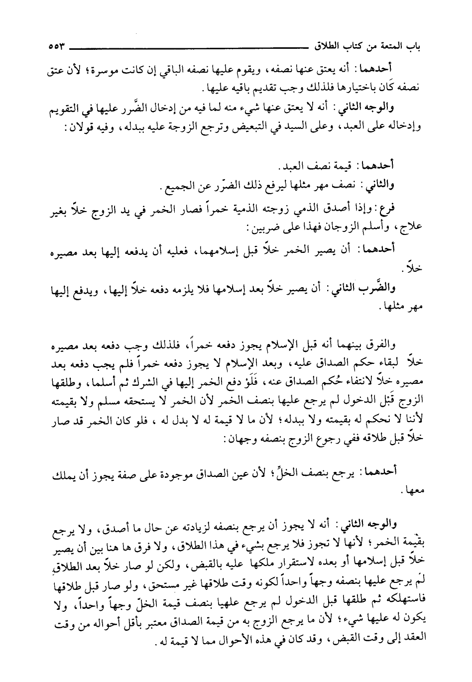 وَالْوَجْهُ الثَّانِي: أَنَّهُ لَا يَجُوزُ أَنْ يَرْجِعَ بِنِصْفِهِ لِزِيَادَتِهِ عَنْ حَالِ مَا أَصْدَقَ، وَلَا يَرْجِعُ بِقِيمَةِ الْخَمْرِ؛ لِأَنَّهَا لَا تَجُوزُ فَلَا يَرْجِعُ بِشَيْءٍ فِي هَذَا الطَّلَاقِ، وَلَا فَرْقَ هَاهُنَا بَيْنَ أَنْ يَصِيرَ خَلًّا قَبْلَ إِسْلَامِهَا أَوْ بَعْدَهُ لِاسْتِقْرَارِ مِلْكِهَا عَلَيْهِ بِالْقَبْضِ، وَلَكِنْ لَوْ صَارَ خَلًّا بَعْدَ الطَّلَاقِ لَمْ يَرْجِعْ عَلَيْهَا بِنِصْفِهِ، وَجْهًا وَاحِدًا لِكَوْنِهِ وَقْتَ طَلَاقِهَا غَيْرَ مُسْتَحَقٍّ، وَلَوْ صَارَ قَبْلَ طَلَاقِهَا فَاسْتَهْلَكَهُ ثُمَّ طَلَّقَهَا قَبْلَ الدُّخُولِ لَمْ يَرْجِعْ عَلَيْهَا بِنِصْفِ قِيمَةِ الْخَلِّ وَجْهًا وَاحِدًا، وَلَا يَكُونُ لَهُ عَلَيْهَا شَيْءٌ؛ لِأَنَّ مَا يَرْجِعُ الزَّوْجُ بِهِ مِنْ قِيمَةِ الصَّدَاقِ مُعْتَبَرٌ بِأَقَلِّ أَحْوَالِهِ مِنْ وَقْتِ الْعَقْدِ إِلَى وَقْتِ الْقَبْضِ، وَقَدْ كَانَ فِي هَذِهِ الْأَحْوَالِ مِمَّا لَا قِيمَةَ لَهُ.