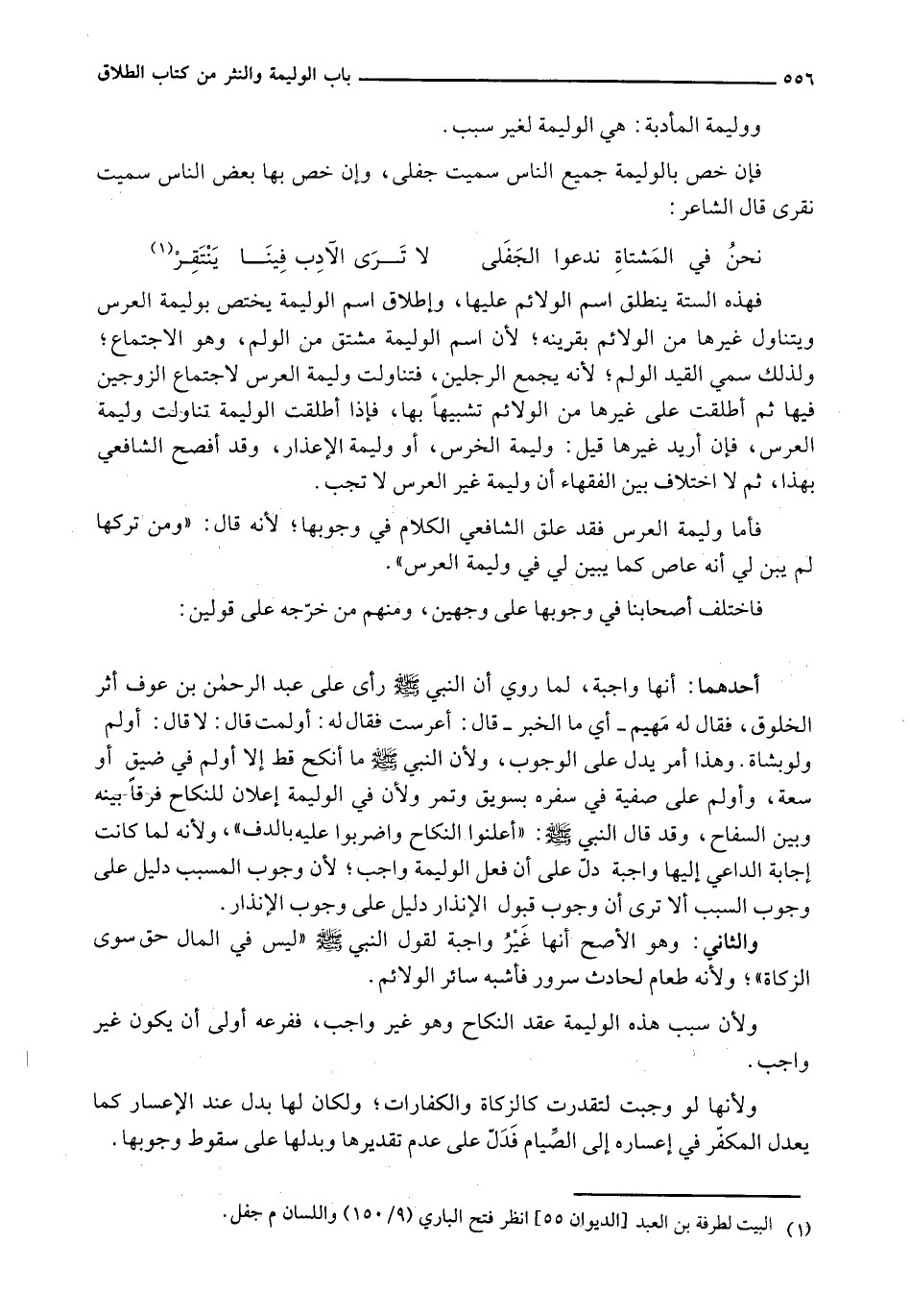 فَأَمَّا وَلِيمَةُ الْعُرْسِ فَقَدْ عَلَّقَ الشَّافِعِيُّ الْكَلَامَ فِي وُجُوبِهَا؛ لِأَنَّهُ قَالَ: " وَمَنْ تَرَكَهَا لَمْ يَبِنْ لِي أَنَّهُ عَاصٍ كَمَا يَبِينُ لِي فِي وَلِيمَةِ الْعُرْسِ ".