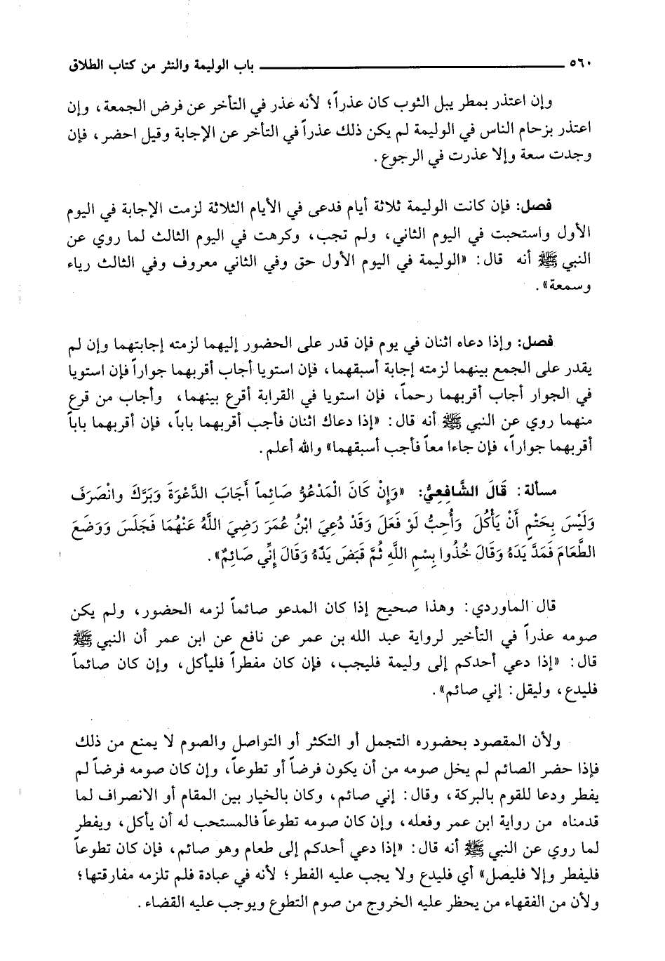 قَالَ الْمَاوَرْدِيُّ: وَهَذَا صَحِيحٌ إِذَا كَانَ الْمَدْعُوُّ صَائِمًا لَزِمَهُ الْحُضُورُ، وَلَمْ يَكُنْ صَوْمُهُ عُذْرًا فِي التَّأْخِيرِ لِرِوَايَةِ عَبْدِ اللَّهِ بْنِ عُمَرَ عَنْ نَافِعٍ عَنِ ابْنِ عُمَرَ أَنَّ النَّبِيَّ - صَلَّى اللَّهُ عَلَيْهِ وَسَلَّم َ - قَالَ: " إِذَا دُعِيَ أَحَدُكُمْ إِلَى وَلِيمَةٍ فَلْيُجِبْ، فَإِنْ كَانَ مُفْطِرًا فَلْيَأْكُلْ، وَإِنْ كَانَ صَائِمًا فَلْيَدْعُ، وَلْيَقُلْ: إِنِّي صَائِمٌ ".