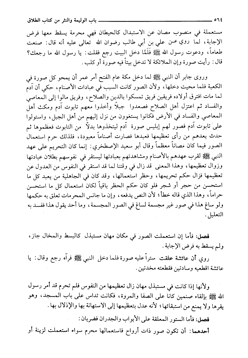 وَرَوَى جَابِرٍ أَنَّ النَّبِيَّ - صَلَّى اللَّهُ عَلَيْهِ وَسَلَّم َ - لَمَّا دَخَلَ مَكَّةَ عَامَ الْفَتْحِ أَمَرَ عُمَرَ أَنْ يَمْحُوَ كُلَّ صُورَةٍ فِي الْكَعْبَةِ فَلَمَّا مُحِيَتْ دَخَلَهَا، وَلِأَنَّ الصُّوَرَ كَانَتِ السَّبَبَ فِي عِبَادَاتِ الْأَصْنَامِ، حُكِيَ أَنَّ آدَمَ لَمَّا مَاتَ افْتَرَقَ أَوْلَادُهُ فَرِيقَيْنِ فَرِيقٌ تَمَسَّكُوا بِالدِّينِ وَالصَّلَاحِ، وَفَرِيقٌ مَالُوا إِلَى الْمَعَاصِي وَالْفَسَادِ ثُمَّ اعْتَزَلَ أَهْلُ الصَّلَاحِ فَصَعِدُوا جَبَلًا وَأَخَذُوا مَعَهُمْ تَابُوتَ آدَمَ وَمَكَثَ أَهْلُ الْمَعَاصِي وَالْفَسَادِ فِي الْأَرْضِ فَكَانُوا يَسْتَغْوُونَ مَنْ نَزَلَ إِلَيْهِمْ مَنْ أَهْلِ الْجَبَلِ، وَاسْتَوْلَوْا عَلَى تَابُوتِ آدَمَ فَصَوَّرَ لَهُمْ إبليس صورة آدم ليتخذوا بَدَلًا مِنَ التَّابُوتِ فَعَظَّمُوهَا ثُمَّ حَدَثَ بَعْدَهُمْ مَنْ رَأَى تَعْظِيمَهَا فَعَبَدَهَا فَصَارَتْ أَصْنَامًا مَعْبُودَةً، فَلِذَلِكَ حُرِّمَ اسْتِعْمَالُ الصُّوَرِ فِيمَا كَانَ مُصَانًا مُعَظَّمًا وَقَالَ أَبُو سَعِيدٍ الْإِصْطَخْرِيُّ: إِنَّمَا كَانَ التَّحْرِيمُ عَلَى عَهْدِ النَّبِيِّ - صَلَّى اللَّهُ عَلَيْهِ وَسَلَّم َ - لِقُرْبِ عَهْدِهِمْ بِالْأَصْنَامِ وَمُشَاهَدَتِهِمْ بِعِبَادَتِهَا لِيَسْتَقِرَّ فِي نُفُوسِهِمْ بُطْلَانُ عِبَادَتِهَا وَزَوَالُ تَعْظِيمِهَا، وَهَذَا الْمَعْنَى قَدْ زَالَ فِي وَقْتِنَا لِمَا قَدِ اسْتَقَرَّ فِي النُّفُوسِ مِنَ الْعُدُولِ عَنْ تَعْظِيمِهَا فَزَالَ حُكْمُ تَحْرِيمِهَا، وَحَظْرُ اسْتِعْمَالِهَا، وَقَدْ كَانَ فِي الْجَاهِلِيَّةِ مَنْ يَعْبُدُ كُلَّ مَا اسْتَحْسَنَ مِنْ حجر تَحْرِيمِهَا، وَحَظْرُ اسْتِعْمَالِهَا، وَقَدْ كَانَ فِي الْجَاهِلِيَّةِ مَنْ يَعْبُدُ كُلَّ مَا اسْتَحْسَنَ مِنْ حَجَرٍ أَوْ شَجَرٍ فَلَوْ كَانَ حُكْمُ الْحَظْرِ بَاقِيًا لَكَانَ اسْتِعْمَالُ كُلِّ مَا اسْتُحْسِنَ حَرَامًا، وَهَذَا الَّذِي قَالَهُ خَطَأٌ؛ لِأَنَّ النَّصَّ يَدْفَعُهُ، وَإِنَّ مَا جَانَسَ الْمُحَرَّمَاتِ تَعَلَّقَ بِهِ حُكْمُهَا وَلَوْ سَاغَ هَذَا فِي صُوَرٍ غَيْرِ مُجَسَّمَةٍ لَسَاغَ فِي الصُّوَرِ الْمُجَسَّمَةِ، وَمَا أَحَدٌ يَقُولُ هَذَا فَفَسَدَ بِهِ التَّعْلِيلُ.