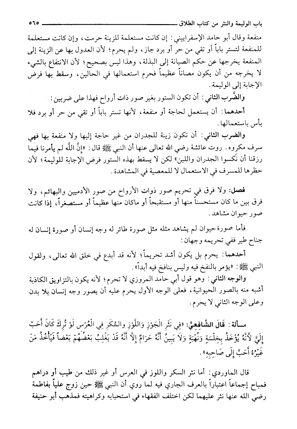 وَالضَّرْبُ الثَّانِي: أَنْ تَكُونَ زِينَةً لِلْجُدْرَانِ مِنْ غَيْرِ حَاجَةٍ إِلَيْهَا وَلَا مَنْفَعَةٍ بِهَا فَهِيَ سَرَفٌ مَكْرُوهٌ. رَوَتْ عَائِشَةُ رَضِيَ اللَّهُ تَعَالَى عَنْهَا أَنَّ النَّبِيَّ - صَلَّى اللَّهُ عَلَيْهِ وَسَلَّم َ - قَالَ: " إِنَ اللَّهَ لَمْ يَأْمُرْنَا فِيمَا رَزَقَنَا أن نكسوا الْجُدْرَانَ وَاللَّبِنَ " لَكِنْ لَا يَسْقُطُ بِهَذِهِ السُّتُورِ فَرْضُ الْإِجَابَةِ لِلْوَلِيمَةِ؛ لِأَنَّ حَظْرَهَا لِلْمُسْرِفِ فِي الِاسْتِعْمَالِ لَا لِلْمَعْصِيَةِ فِي الْمُشَاهَدَةِ.