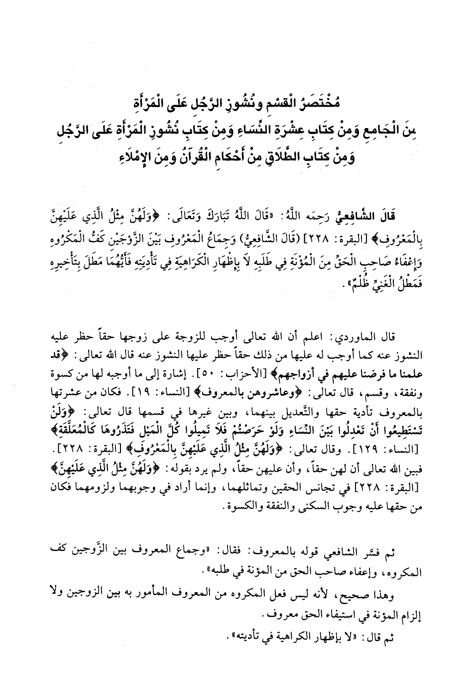 مختصر القسم ونشوز الرجل على المرأة من الجامع ومن كتاب عشرة النساء ومن كتاب نشوز المرأة على الرجل ومن كتاب الطلاق من أحكام القرآن ومن الإملاء