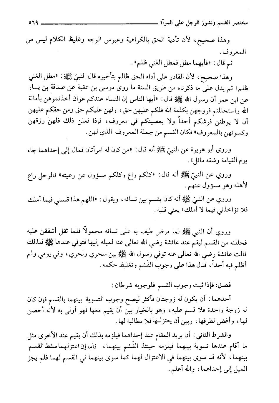 وَهَذَا صَحِيحٌ، لِأَنَّ الْقَادِرَ عَلَى أَدَاءِ الْحَقِّ ظَالِمٌ بِتَأْخِيرِهِ قَالَ النَّبِيُّ - صَلَّى اللَّهُ عَلَيْهِ وَسَلَّم َ -: " مَطْلُ الْغَنِيِّ ظُلْمٌ " ثُمَّ يَدُلُّ عَلَى مَا ذَكَرْنَاهُ مِنْ طَرِيقِ السُّنَّةِ مَا رَوَى مُوسَى بْنُ عُقْبَةَ عَنْ صَدَقَةَ بْنِ يَسَارٍ عَنِ ابْنِ عُمَرَ أَنَّ رَسُولَ اللَّهِ - صَلَّى اللَّهُ عَلَيْهِ وَسَلَّم َ - قال: " أيها الناس إن النساء عندكم عوان أخذتموهن بأمانة الله استحللتم فروجن بِكَلِمَةِ اللَّهِ فَلَكُمْ عَلَيْهِنَّ حَقٌّ، وَلَهُنَّ عَلَيْكُمْ حَقٌّ وَمِنْ حَقِّكُمْ عَلَيْهِنَّ أَنْ لَا يُوطِئْنَ فُرُشَكُمْ أَحَدًا وَلَا يَعْصِينَكُمْ فِي مَعْرُوفٍ، فَإِذَا فَعَلْنَ ذَلِكَ فَلَهُنَّ رِزْقُهُنَّ وَكِسْوَتُهُنَّ بِالْمَعْرُوفِ " فَكَانَ الْقَسْمُ مِنْ جُمْلَةِ الْمَعْرُوفِ الَّذِي لَهُنَّ.