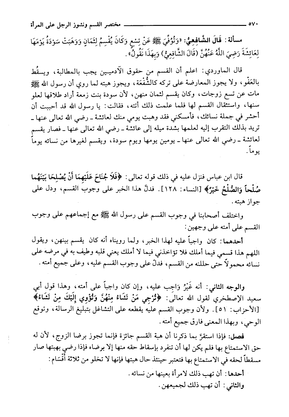 وَاخْتَلَفَ أَصْحَابُنَا فِي وُجُوبِ الْقَسْمِ عَلَى رَسُولِ اللَّهِ - صَلَّى اللَّهُ عَلَيْهِ وَسَلَّم َ - مَعَ إِجْمَاعِهِمْ عَلَى وُجُوبِ الْقَسْمِ عَلَى أُمَّتِهِ عَلَى وَجْهَيْنِ:
