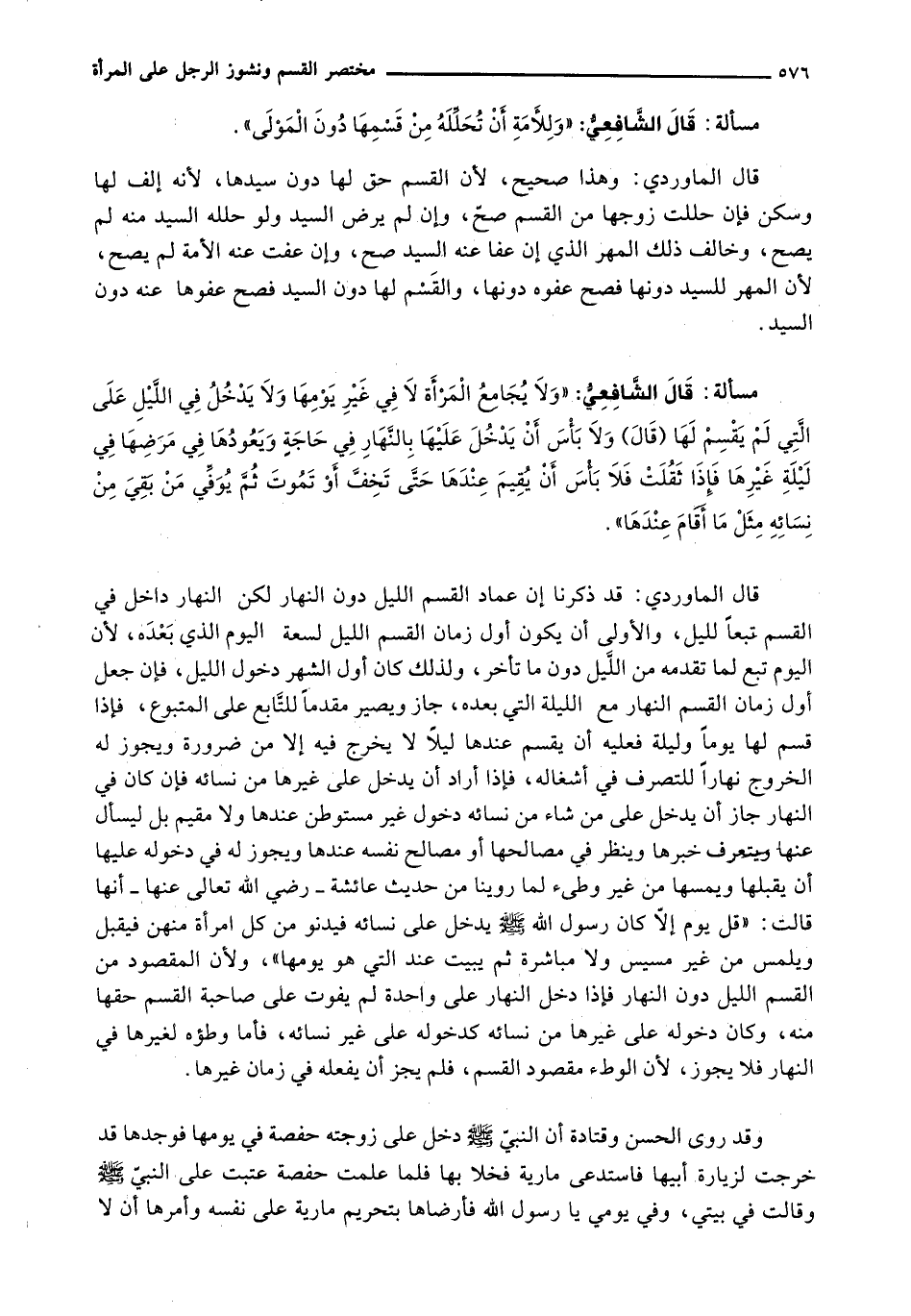 قَالَ الْمَاوَرْدِيُّ: قَدْ ذَكَرْنَا أَنَّ عِمَادَ الْقَسْمِ اللَّيْلُ دُونَ النَّهَارِ لَكِنَّ النَّهَارَ دَاخِلٌ فِي الْقَسْمِ تَبَعًا لِلَّيْلِ، وَالْأَوْلَى أَنْ يَكُونَ أَوَّلُ زَمَانِ الْقَسْمِ اللَّيْلَ لِسَعَةِ الْيَوْمِ الَّذِي بَعْدَهُ، لِأَنَّ الْيَوْمَ تَبَعٌ لِمَا تَقَدَّمَهُ مِنَ اللَّيْلِ دُونَ مَا تَأَخَّرَ، وَلِذَلِكَ كَانَ أَوَّلُ الشَّهْرِ دُخُولَ اللَّيْلِ، فَإِنْ جَعَلَ أَوَّلَ زَمَانِ الْقَسْمِ النَّهَارَ مَعَ اللَّيْلَةِ الَّتِي بَعْدَهُ، جَازَ وَيَصِيرُ مُقَدِّمًا لِلتَّابِعِ عَلَى الْمَتْبُوعِ، فَإِذَا قَسَمَ لَهَا يَوْمًا وَلَيْلَةً فَعَلَيْهِ أَنْ يَقْسِمَ عِنْدَهَا لَيْلًا لَا يَخْرُجُ فِيهِ إِلَّا مِنْ ضَرُورَةٍ وَيَجُوزُ لَهُ الْخُرُوجُ نَهَارًا لِلتَّصَرُّفِ فِي أَشْغَالِهِ، فَإِذَا أَرَادَ أَنْ يَدْخُلَ عَلَى غَيْرِهَا مِنْ نِسَائِهِ فَإِنْ كَانَ فِي النَّهَارِ جَازَ أَنْ يَدْخُلَ عَلَى مَنْ شَاءَ مِنْ نِسَائِهِ دُخُولَ غَيْرِ مُسْتَوْطِنٍ عِنْدَهَا وَلَا مُقِيمٍ بَلْ لِيَسْأَلَ عَنْهَا وَيَتَعَرَّفَ خَبَرَهَا وَيَنْظُرَ فِي مَصَالِحِهَا أَوْ مَصَالِحِ نَفْسِهِ عِنْدَهَا وَيَجُوزُ لَهُ فِي دُخُولِهِ عَلَيْهَا أَنْ يقبلها ويمسها من غير وطئ لما روينا من حديث عائشة - رضي الله تعالى عنها - أَنَّهَا قَالَتْ: " قَلَّ يَوْمٌ إِلَّا كَانَ رَسُولُ اللَّهِ - صَلَّى اللَّهُ عَلَيْهِ وَسَلَّم َ - يدخل على نسائه فيدنو من كل امرأة مِنْهُنَّ فَيُقَبِّلُ وَيَلْمَسُ مِنْ غَيْرِ مَسِيسٍ وَلَا مُبَاشَرَةٍ ثُمَّ يَبِيتُ عِنْدَ الَّتِي هُوَ يَوْمُهَا "، وَلِأَنَّ الْمَقْصُودَ مِنَ الْقَسْمِ اللَّيْلُ دُونَ النَّهَارِ فَإِذَا دَخَلَ النَّهَارُ عَلَى وَاحِدَةٍ لَمْ يُفَوِّتْ عَلَى صَاحِبَةِ الْقَسْمِ حَقَّهَا مِنْهُ، وَكَانَ دُخُولُهُ عَلَى غَيْرِهَا مِنْ نِسَائِهِ كَدُخُولِهِ عَلَى غَيْرِ نِسَائِهِ، فَأَمَّا وَطْؤُهُ لِغَيْرِهَا فِي النَّهَارِ فَلَا يَجُوزُ، لِأَنَّ الْوَطْءَ مَقْصُودُ الْقَسْمِ، فَلَمْ يَجُزْ أَنْ يَفْعَلَهُ فِي زَمَانِ غَيْرِهَا.