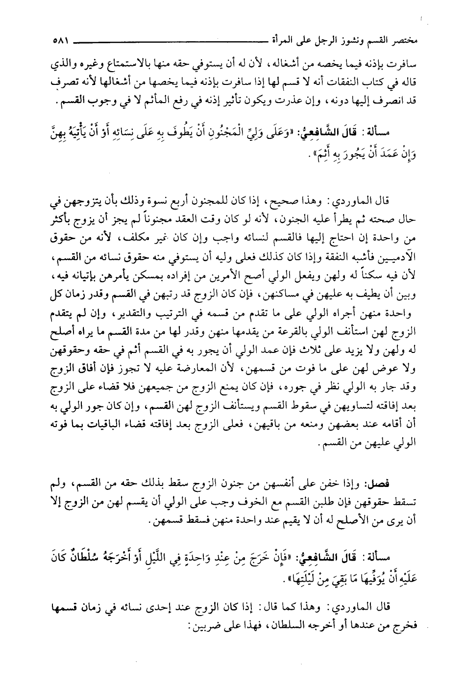 قال الشافعي: " وَعَلَى وَلِيِّ الْمَجْنُونِ أَنْ يَطُوفَ بِهِ عَلَى نِسَائِهِ أَوْ أَنْ يَأْتِيَهُ بِهِنَّ وَإِنْ عَمَدَ أَنْ يَجُورَ بِهِ أَثِمَ ".