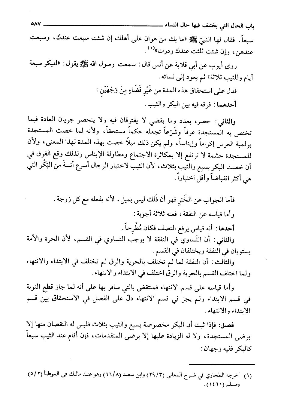 وَالثَّانِي: حَصْرُهُ بِعَدَدٍ وَمَا يَقْضِي لَا يَفْتَرِقَانِ فِيهِ وَلَا يَنْحَصِرُ جَرَيَانُ الْعَادَةِ فِيمَا تَخْتَصُّ بِهِ الْمُسْتَجَدَّةُ عُرْفًا وَشَرْعًا تَجْعَلُهُ حُكْمًا مُسْتَحَقًّا، وَلِأَنَّهُ لَمَّا خُصَّتِ الْمُسْتَجَدَّةُ بِوَلِيمَةِ الْعُرْسِ إِكْرَامًا وَإِينَاسًا، وَلَمْ يَكُنْ ذَلِكَ مَيْلًا خُصَّتْ بِهَذِهِ الْمُدَّةِ لِهَذَا الْمَعْنَى، وَلِأَنَّ لِلْمُسْتَجَدَّةِ حِشْمَةً لَا تَرْتَفِعُ إِلَّا بِمُكَاثَرَةِ الِاجْتِمَاعِ وَمُطَاوَلَةِ الْإِينَاسِ وَلِذَلِكَ وَقَعَ الْفَرْقُ فِي أَنْ خُصَّتِ الْبِكْرُ بِسَبْعٍ وَالثَّيِّبُ بِثَلَاثٍ، لِأَنَّ الثَّيِّبَ لِاخْتِبَارِ الرِّجَالِ أَسْرَعُ أَنَسَةً مِنَ الْبِكْرِ الَّتِي هِيَ أَكْثَرُ انْقِبَاضًا وَأَقَلُّ اخْتِبَارًا.