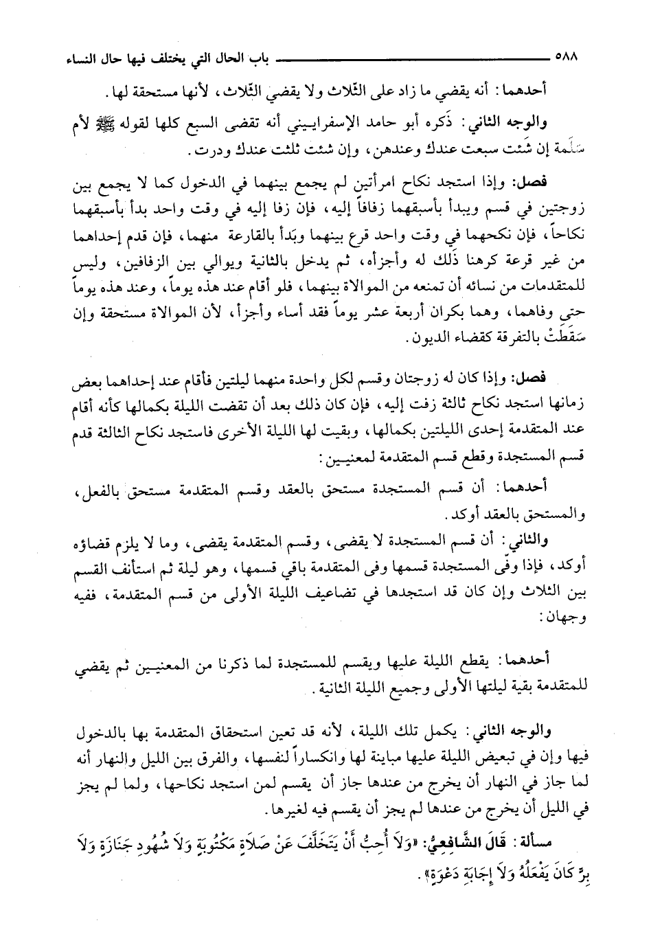 وَإِذَا كَانَ لَهُ زَوْجَتَانِ وَقَسَمَ لِكُلِّ وَاحِدَةٍ مِنْهُمَا لَيْلَتَيْنِ فَأَقَامَ عِنْدَ إِحْدَاهِمَا بَعْضَ زَمَانِهَا اسْتَجَدَّ نِكَاحَ ثَالِثَةٍ زُفَّتْ إِلَيْهِ، فَإِنْ كَانَ ذَلِكَ بَعْدَ أَنْ نقضت اللَّيْلَةُ بِكَمَالِهَا كَأَنَّهُ أَقَامَ عِنْدَ الْمُتَقَدِّمَةِ إِحْدَى اللَّيْلَتَيْنِ بِكَمَالِهَا، وَبَقِيَتْ لَهَا اللَّيْلَةُ الْأُخْرَى فَاسْتَجَدَّ نِكَاحَ الثَّالِثَةِ قَدَّمَ قَسْمَ الْمُسْتَجَدَّةِ وَقَطَعَ قَسْمَ الْمُتَقَدِّمَةِ لِمَعْنَيَيْنِ:
