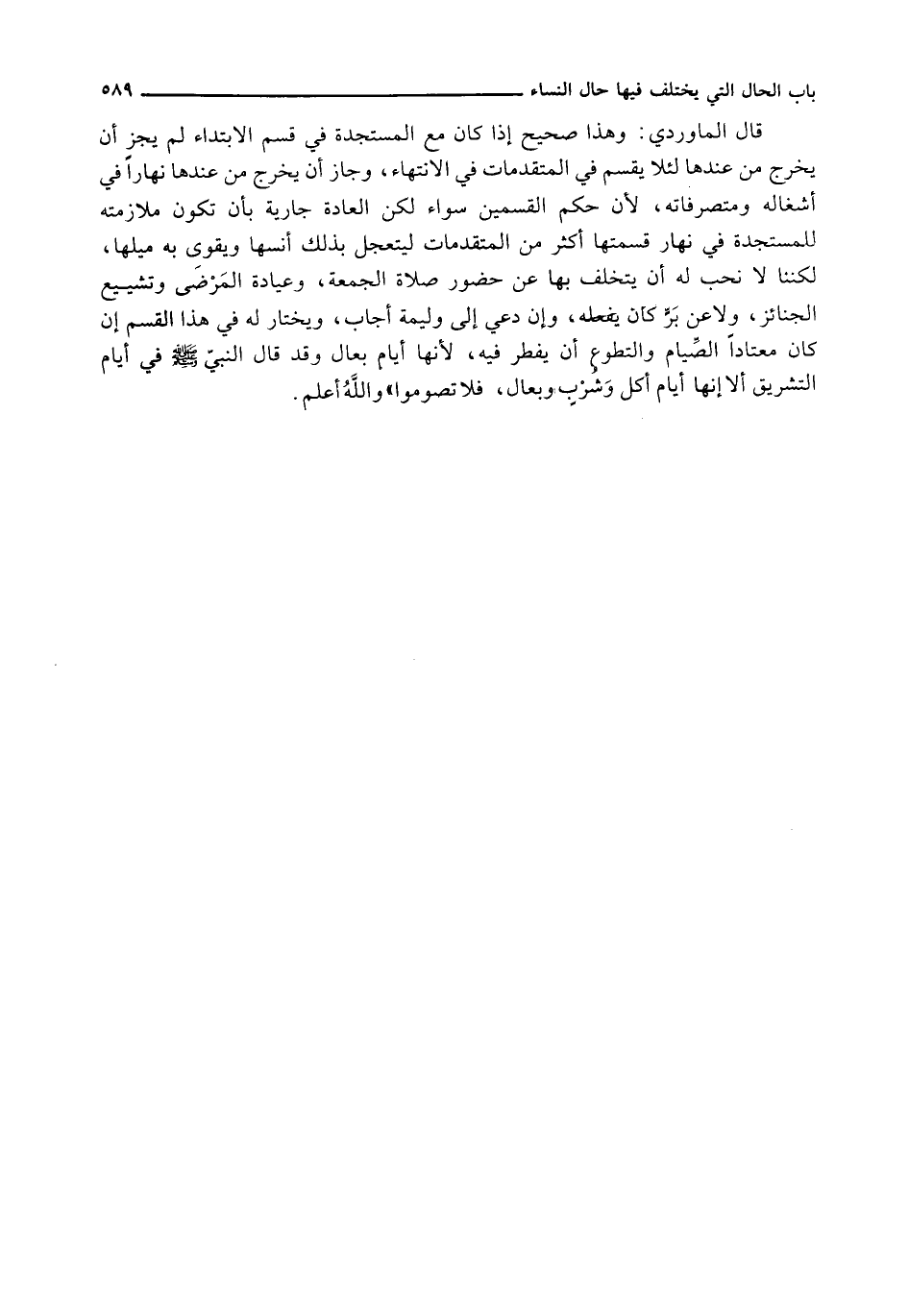قَالَ الْمَاوَرْدِيُّ: وَهَذَا صَحِيحٌ إِذَا كَانَ مَعَ الْمُسْتَجَدَّةِ فِي قَسْمِ الِابْتِدَاءِ لَمْ يَجُزْ أَنْ يَخْرُجَ مِنْ عِنْدِهَا لِئَلَّا يَقْسِمَ فِي الْمُتَقَدِّمَاتِ فِي الِانْتِهَاءِ، وَجَازَ أَنْ يَخْرُجَ مِنْ عِنْدِهَا نَهَارًا فِي أَشْغَالِهِ وَمُتَصَرَّفَاتِهِ، لِأَنَّ حُكْمَ الْقَسْمَيْنِ سَوَاءٌ لَكِنَّ الْعَادَةَ جَارِيَةٌ بِأَنْ تَكُونَ مُلَازَمَتُهُ للمستجدة فِي نَهَارِ قَسْمَتِهَا أَكْثَرَ مِنَ الْمُتَقَدِّمَاتِ لِيَتَعَجَّلَ بذلك أنسها ويقوى بها مَيْلُهَا، لَكِنَّنَا لَا نُحِبُّ لَهُ أَنْ يَتَخَلَّفَ بِهَا عَنْ حُضُورِ صَلَاةِ الْجُمُعَةِ، وَعِيَادَةِ الْمَرْضَى وَتَشْيِيعِ الْجَنَائِزِ، وَلَا عَنْ بِرٍّ كَانَ يَفْعَلُهُ، وَإِنْ دُعِيَ إِلَى وَلِيمَةٍ أَجَابَ، وَيُخْتَارُ لَهُ فِي هَذَا الْقَسْمِ إِنْ كَانَ مُعْتَادًا الصِّيَامَ وَالتَّطَوُّعَ أَنْ يُفْطِرَ فِيهِ، لِأَنَّهَا أَيَّامُ بِعَالٍ وَقَدْ قَالَ النَّبِيُّ - صَلَّى اللَّهُ عَلَيْهِ وَسَلَّم َ - فِي أَيَّامِ التَّشْرِيقِ " أَلَا إِنَّهَا أَيَّامُ أَكْلٍ وشربٍ وَبِعَالٍ، فَلَا تَصُومُوا " وَاللَّهُ أَعْلَمُ.