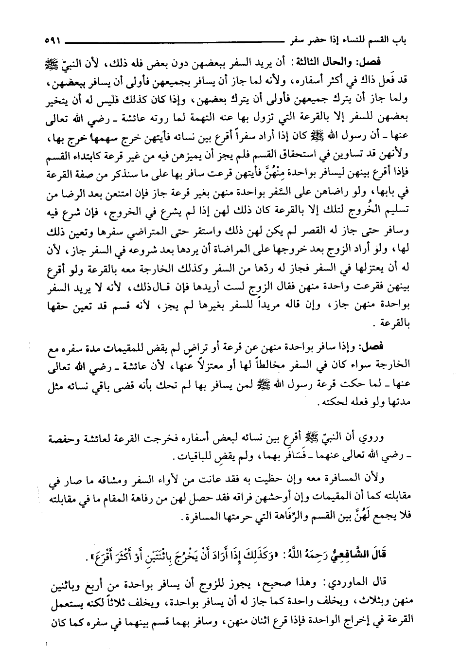 ووري أن النبي - صَلَّى اللَّهُ عَلَيْهِ وَسَلَّم َ - أَقْرَعَ بَيْنَ نِسَائِهِ لِبَعْضِ أَسْفَارِهِ فَخَرَجَتِ الْقُرْعَةُ لِعَائِشَةَ وَحَفْصَةَ - رَضِيَ اللَّهُ تَعَالَى عَنْهُمَا - فَسَافَرَ بِهِمَا، وَلَمْ يَقْضِ لِلْبَاقِيَاتِ.