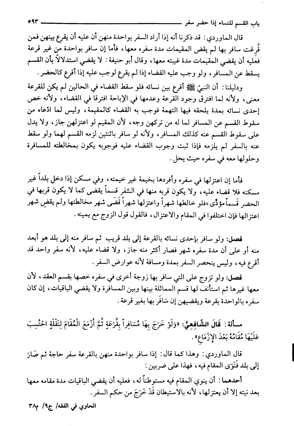 قَالَ الْمَاوَرْدِيُّ: قَدْ ذَكَرْنَا أَنَّهُ إِذَا أَرَادَ السَّفَرَ بِوَاحِدَةٍ مِنْهُنَّ أَنَّ عَلَيْهِ أَنْ يَقْرَعَ بَيْنَهُنَّ فَمَنْ قُرِعَتْ سَافَرَ بِهَا لَمْ يَقْضِ الْمُقِيمَاتِ مُدَّةَ سَفَرِهِ مَعَهَا، فَأَمَّا إِنْ سَافَرَ بِوَاحِدَةٍ مِنْ غَيْرِ قُرْعَةٍ فَعَلَيْهِ أَنْ يَقْضِيَ الْمُقِيمَاتِ مُدَّةَ غَيْبَتِهِ مَعَهَا، وَقَالَ أَبُو حَنِيفَةَ: لَا يَقْضِي اسْتِدْلَالًا بِأَنَّ الْقَسْمَ يَسْقُطُ عَنِ الْمُسَافِرِ، وَلَوْ وَجَبَ عَلَيْهِ الْقَضَاءُ إِذَا لَمْ يَقْرَعْ لَوَجَبَ عَلَيْهِ إِذَا أَقْرَعَ كَالْحَضَرِ.