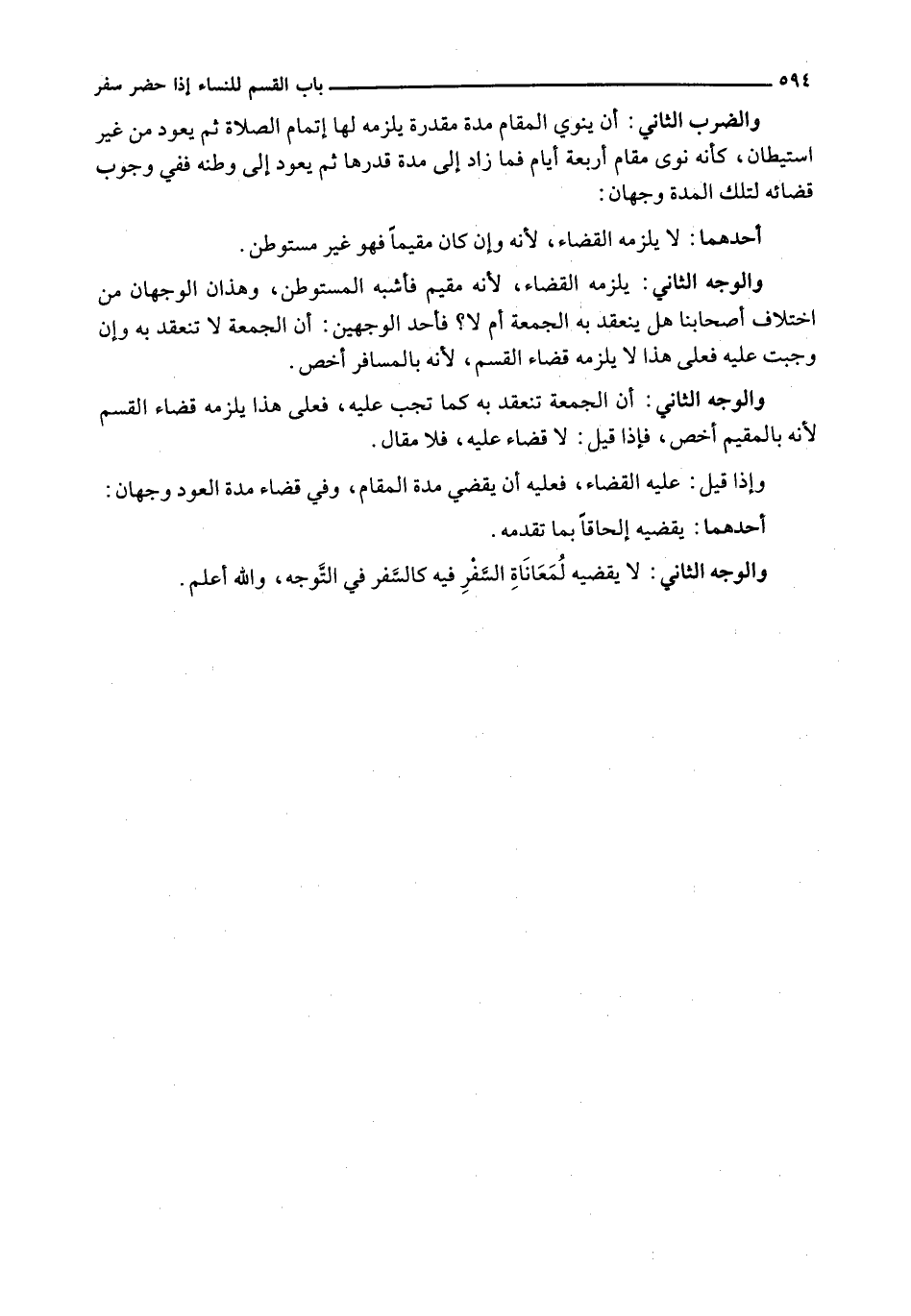 وَالْوَجْهُ الثَّانِي: أَنَّ الْجُمُعَةَ تَنْعَقِدُ بِهِ كَمَا تَجِبُ عَلَيْهِ، فَعَلَى هَذَا يَلْزَمُهُ قَضَاءُ الْقَسْمِ لِأَنَّهُ بِالْمُقِيمِ أَخَصُّ، فَإِذَا قِيلَ: لَا قَضَاءَ عَلَيْهِ، فَلَا مَقَالَ.