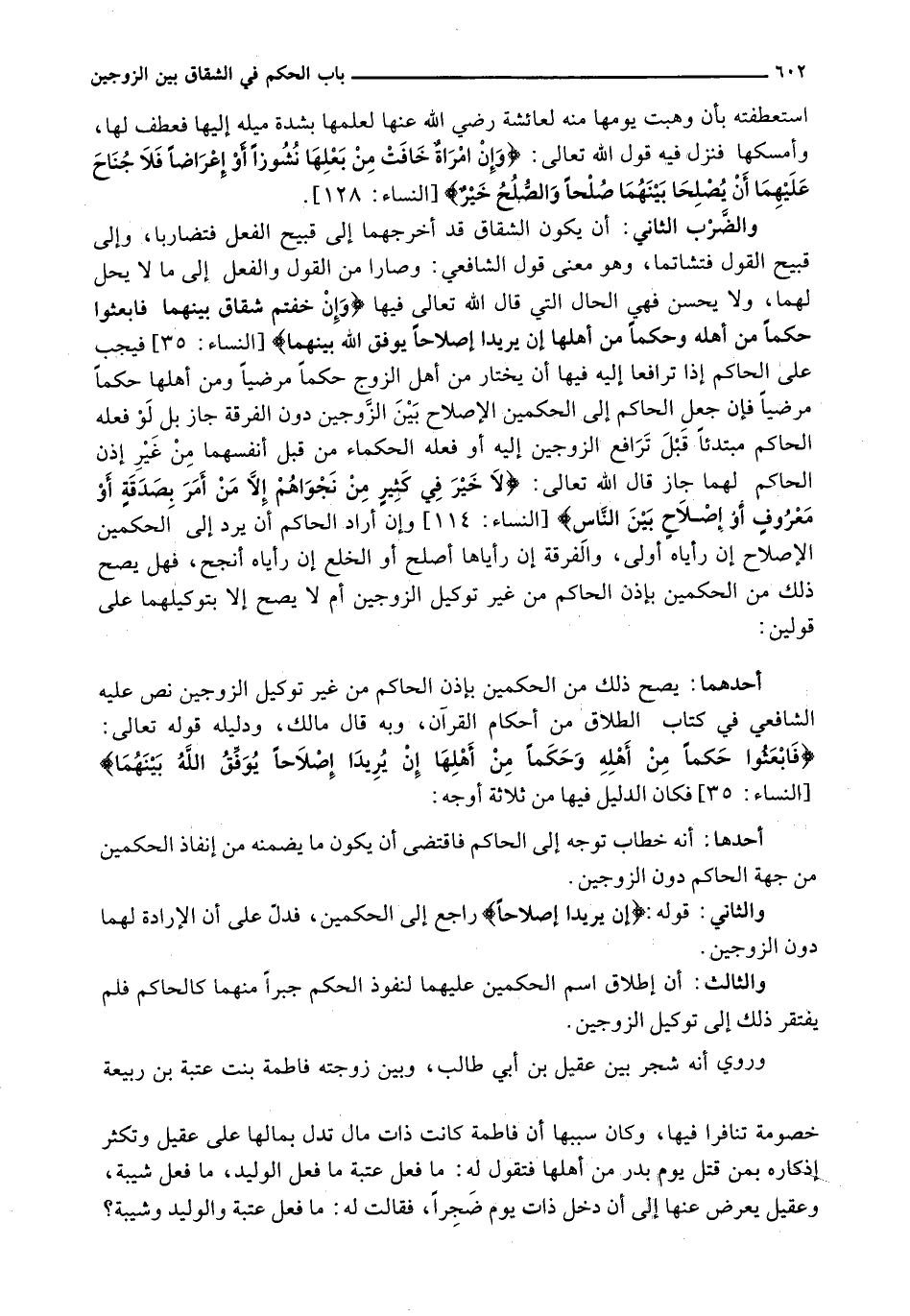 وَالضَّرْبُ الثَّانِي: أَنْ يَكُونَ الشِّقَاقُ قَدْ أَخْرَجَهُمَا إِلَى قَبِيحِ الْفِعْلِ فَتَضَارَبَا، وَإِلَى قَبِيحِ الْقَوْلِ فَتَشَاتَمَا، وَهُوَ مَعْنَى قَوْلِ الشَّافِعِيِّ: وَصَارَا مِنَ الْقَوْلِ وَالْفِعْلِ إِلَى مَا لَا يَحِلُّ لَهُمَا، وَلَا يَحْسُنُ فَهِيَ الْحَالُ الَّتِي قَالَ اللَّهُ تَعَالَى فِيهَا {وَإِنْ خِفْتُمْ شِقَاقَ بَيْنَهُمَا فَابْعَثُوا حَكَماً مِنْ أهْلَهِ وَحَكَماً مِنْ أهْلِهَا إِنْ يُرِيدَا إِصْلاَحاً يُوَفِقُ اللهُ بَيْنَهُمَا) {النساء: 35) فَيَجِبُ عَلَى الْحَاكِمِ إِذَا تَرَافَعَا إِلَيْهِ فِيهَا أَنْ يَخْتَارَ مِنْ أَهْلِ الزَّوْجِ حَكَمًا مَرْضِيًّا وَمِنْ أَهْلِهَا حَكَمًا مَرْضِيًّا فَإِنْ جَعَلَ الْحَاكِمُ إِلَى الْحَكَمَيْنِ الْإِصْلَاحَ بَيْنَ الزَّوْجَيْنِ دُونَ الْفُرْقَةِ جَازَ بَلْ لَوْ فَعَلَهُ الْحَاكِمُ مُبْتَدِئًا قَبْلَ تَرَافُعِ الزَّوْجَيْنِ إِلَيْهِ أَوْ فَعَلَهُ الْحُكَمَاءُ مِنْ قِبَلِ أَنْفُسِهِمَا مِنْ غَيْرِ إِذْنِ الْحَاكِمِ لَهُمَا جَازَ قَالَ اللَّهُ تَعَالَى {لاَ خَيْرَ فِي كَثِيرٍ مِنْ نَجْوَاهُمْ إِلاِّ مَنْ أَمَرَ بَصَدَقَةٍ أَوْ مَعْرُوفٍ أَوْ إصْلاَحٍ بَيْنَ النَّاسِ) {النساء: 114) وَإِنْ أَرَادَ الْحَاكِمُ أَنْ يَرُدَّ إِلَى الْحَكَمَيْنِ الْإِصْلَاحَ إِنْ رَأَيَاهُ أَوْلَى، وَالَفُرْقَةَ إِنْ رَأَيَاهَا أَصْلَحَ أَوِ الْخُلْعَ إِنْ رَأَيَاهُ أَنْجَحَ، فَهَلْ يَصِحُّ ذَلِكَ مِنَ الْحَكَمَيْنِ بِإِذْنِ الْحَاكِمِ مِنْ غَيْرِ تَوْكِيلِ الزَّوْجَيْنِ أَمْ لَا يَصِحُّ إِلَّا بِتَوْكِيلِهِمَا عَلَى قَوْلَيْنِ: