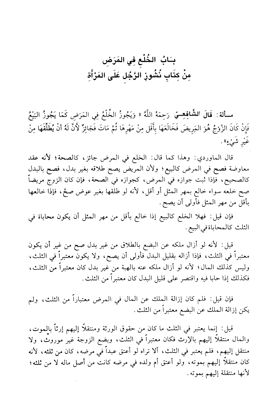 قَالَ الْمَاوَرْدِيُّ: وَهَذَا كَمَا قَالَ: الْخُلْعُ فِي الْمَرَضِ جَائِزٌ، كَالصِّحَّةِ؛ لِأَنَّهُ عَقْدُ مُعَاوَضَةٍ فَصَحَّ فِي الْمَرَضِ كَالْبَيْعِ؛ وَلِأَنَّ الْمَرِيضَ يصح طلاقه بغير بدل، فصح بالبدل كَالصَّحِيحِ، فَإِذَا ثَبَتَ جَوَازُهُ فِي الْمَرَضِ، كَجَوَازِهِ فِي الصِّحَّةِ، فَإِنْ كَانَ الزَّوْجُ مَرِيضًا صَحَّ خُلْعُهُ سَوَاءٌ خَالَعَ بِمَهْرِ الْمِثْلِ أَوْ أَقَلَّ، لِأَنَّهُ لَوْ طَلَّقَهَا بِغَيْرِ عِوَضٍ صَحَّ، فَإِذَا خَالَعَهَا بِأَقَلَّ مِنْ مَهْرِ الْمِثْلِ فَأَوْلَى أَنْ يَصِحَّ.