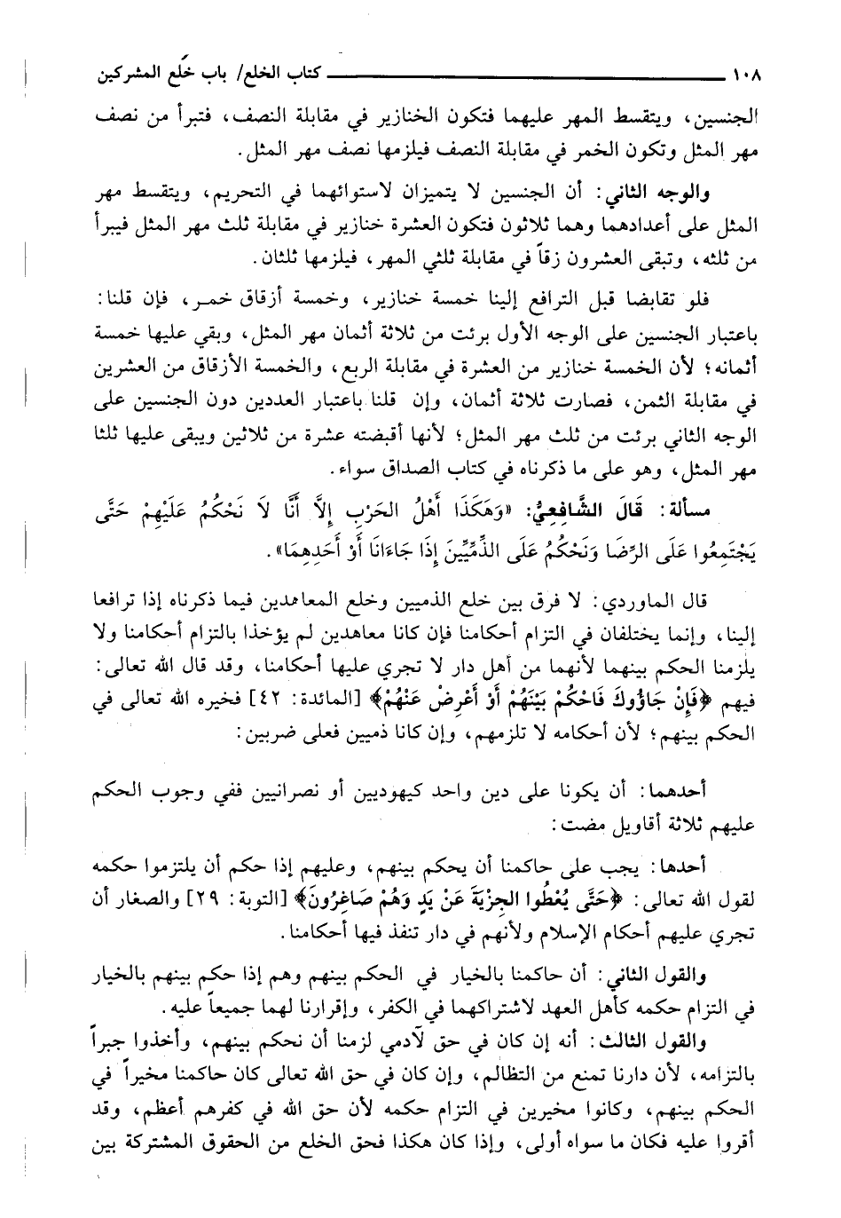 وَالْقَوْلُ الثَّالِثِ: أَنَّهُ إِنْ كَانَ فِي حَقٍّ لِآدَمِيٍّ لَزِمَنَا أَنْ نَحْكُمَ بَيْنَهُمْ، وَأُخِذُوا جَبْرًا بِالْتِزَامِهِ، لِأَنَّ دَارَنَا تَمْنَعُ مِنَ التَّظَالُمِ، وَإِنْ كَانَ فِي حَقِّ اللَّهِ تَعَالَى كَانَ حَاكِمُنَا مُخَيَّرًا فِي الْحُكْمِ بَيْنَهُمْ، وَكَانُوا مُخَيَّرِينَ فِي الْتِزَامِ حُكْمِهِ لِأَنَّ حَقَّ اللَّهِ فِي كُفْرِهِمْ أَعْظَمُ، وَقَدْ أُقِرُّوا عَلَيْهِ فَكَانَ مَا سِوَاهُ أَوْلَى، وَإِذَا كَانَ هَكَذَا فَحَقُّ الْخُلْعِ مِنَ الْحُقُوقِ الْمُشْتَرَكَةِ بَيْنَ