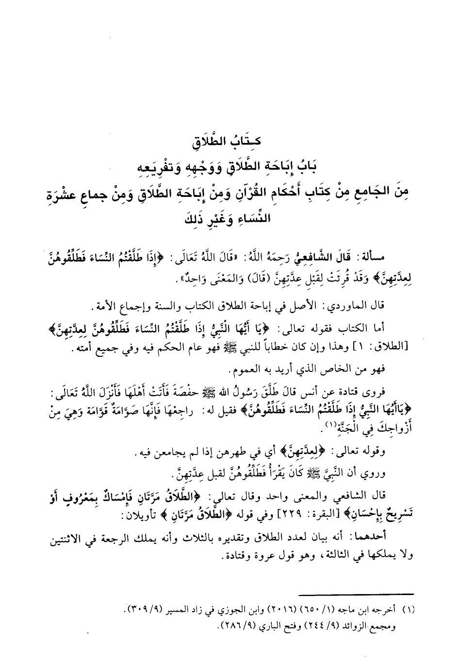 أَمَّا الْكِتَابُ فَقَوْلُهُ تَعَالَى: {يَا أَيُّهَا النَّبِيُّ إِذَا طَلَّقْتُمُ النِّسَاءَ فَطَلِّقُوهُنَّ لِعِدَّتِهِنَّ} [الطلاق: 1] وَهَذَا وَإِنْ كَانَ خِطَابًا لِلنَّبِيِّ - صَلَّى اللَّهُ عَلَيْهِ وَسَلَّم َ - فَهُوَ عَامُّ الْحُكْمِ فِيهِ وَفِي جَمِيعِ أُمَّتِهِ.