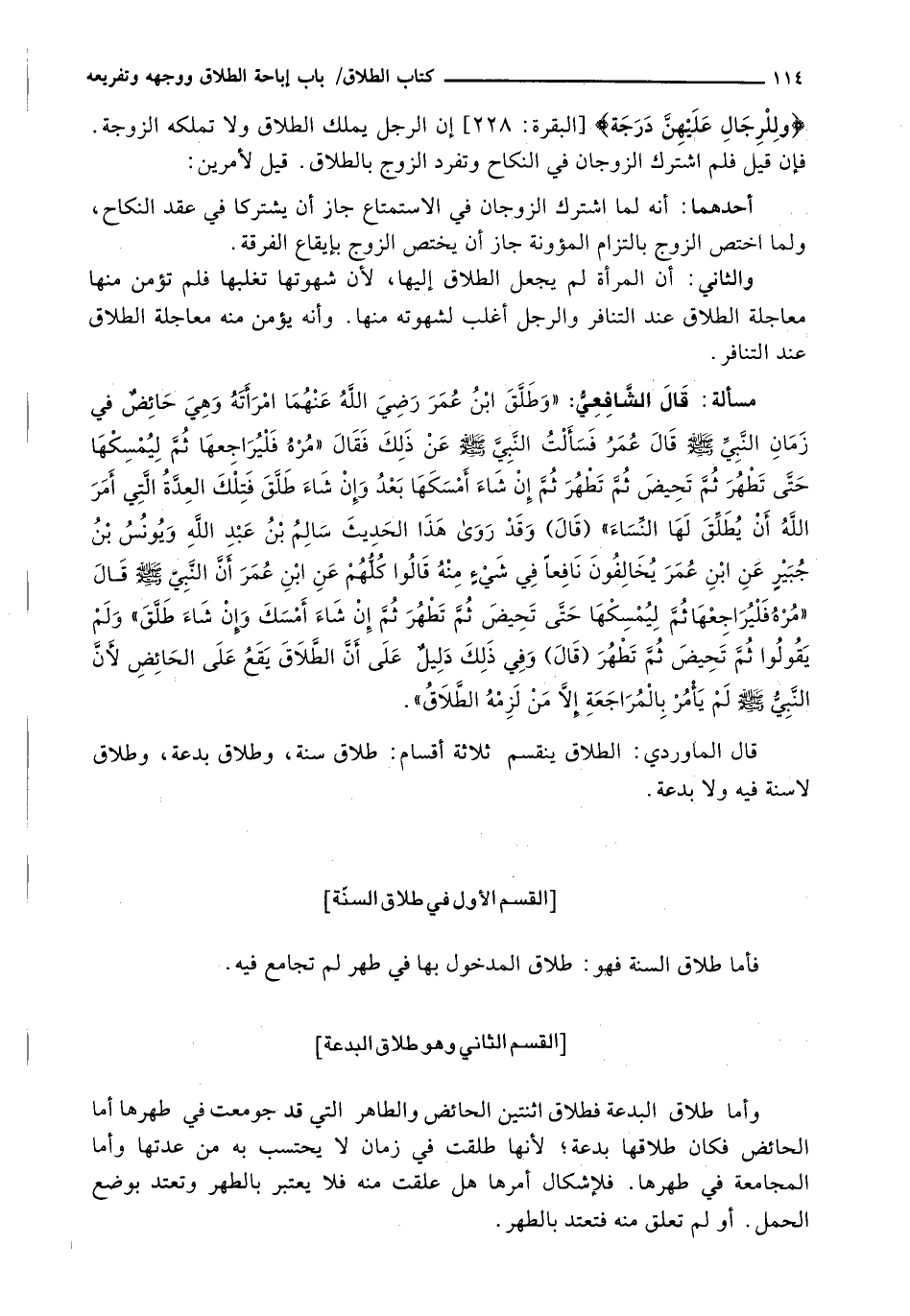 قَالَ الْمَاوَرْدِيُّ: الطَّلَاقُ يَنْقَسِمُ ثَلَاثَةَ أَقْسَامٍ: طَلَاقُ سُنَّةٍ، وَطَلَاقُ بِدْعَةٍ، وَطَلَاقٌ لَا سُنَّةَ فِيهِ ولا بدعة.