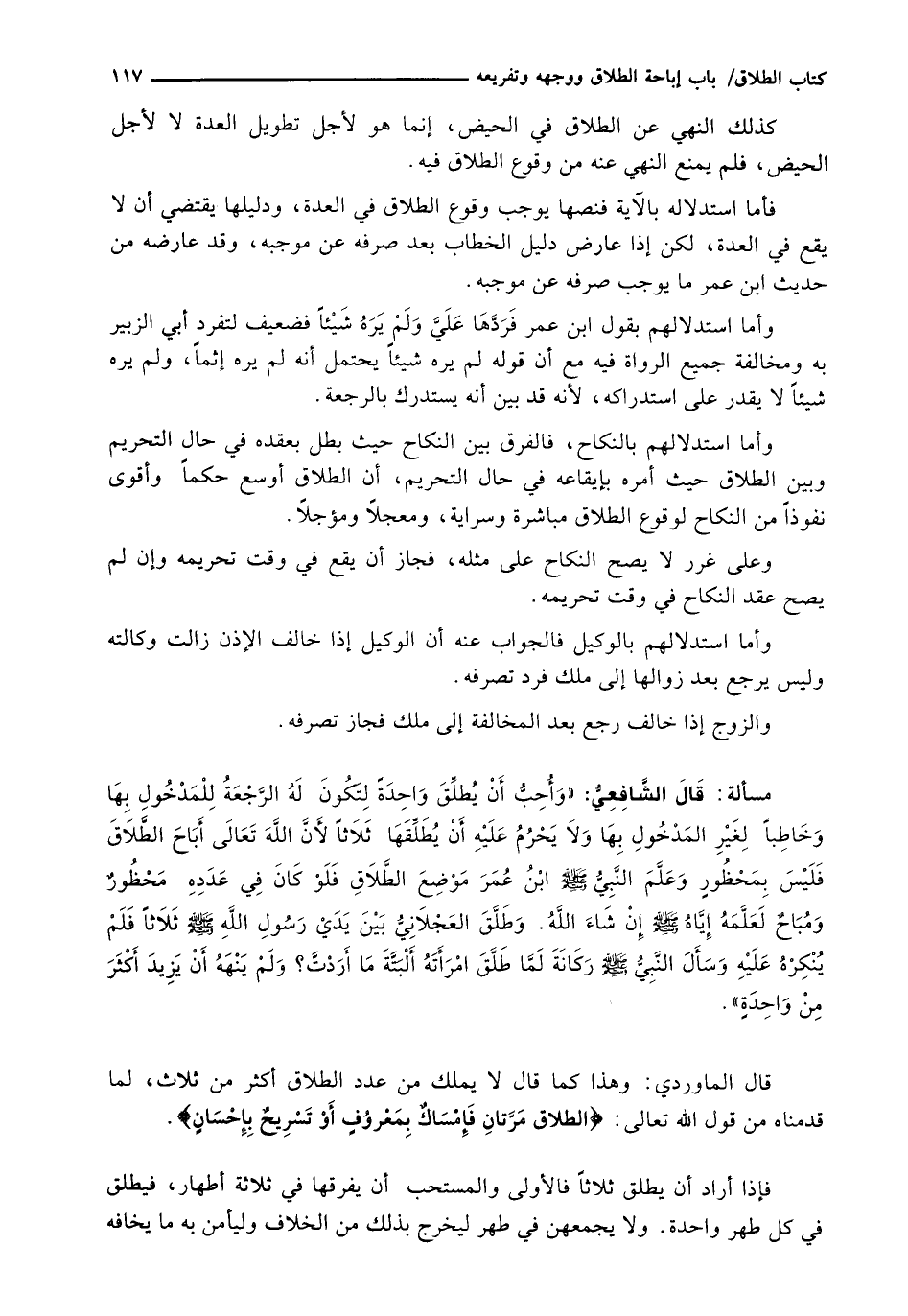 قَالَ الشافعي: (وَأُحِبُّ أَنْ يُطَلِّقَ وَاحِدَةً لِتَكُونَ لَهُ الرَّجْعَةُ لِلْمَدْخُولِ بِهَا وَخَاطِبًا لِغَيْرِ الْمَدْخُولِ بِهَا وَلَا يحرم عليه أن يطلقها ثلاثا لأن الله تعالى أباح الطلاق فليس بمحظور وعلم النبي - صَلَّى اللَّهُ عَلَيْهِ وَسَلَّم َ - ابن عمر موضع الطلاق فلو كان في عدده محظور ومباح لعلمه إياه - صَلَّى اللَّهُ عَلَيْهِ وَسَلَّم َ - إن شاء الله. وطلق العجلاني بَيْنَ يَدَيْ رَسُولِ اللَّهِ - صَلَّى اللَّهُ عَلَيْهِ وَسَلَّم َ - ثلاثا فلم ينكره عليه وسأل النبي - صَلَّى اللَّهُ عَلَيْهِ وَسَلَّم َ - ركانة لما طلق امرأته ألبتة ما أردت؟ ولم ينهه أن يزيد اكثر من واحدة) .