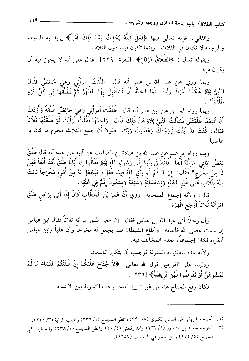 وَبِمَا رَوَاهُ إِبْرَاهِيمُ عَنِ عَبْدِ اللَّهِ بْنِ عُبَادَةَ بْنِ الصَّامِتِ عَنْ أَبِيهِ عَنْ جَدِّهِ أَنَّهُ قَالَ طَلَّقَ بَعْضُ آبَائِي امْرَأَتَهُ أَلْفًا. فَانْطَلَقَ بَنُوهُ إِلَى رَسُولِ اللَّهِ - صَلَّى اللَّهُ عَلَيْهِ وَسَلَّم َ - فَقَالُوا إِنَّ أَبَانَا طَلَّقَ أُمَّنَا أَلْفًا فَهَلْ لَهُ مِنْ مَخْرَجٍ؟ فَقَالَ: إِنَّ أَبَاكُمْ لَمْ يتق الله فيما فَعَلَ؛ فَيَجْعَلَ لَهُ مِنْ أَمْرِهِ مَخْرَجًا بَانَتْ مِنْهُ بِثَلَاثٍ عَلَى غَيْرِ السُّنَّةِ وَتِسْعُمِائَةٍ وَسَبْعَةٌ وَتِسْعُونَ إِثْمٌ فِي عُنُقِهِ.