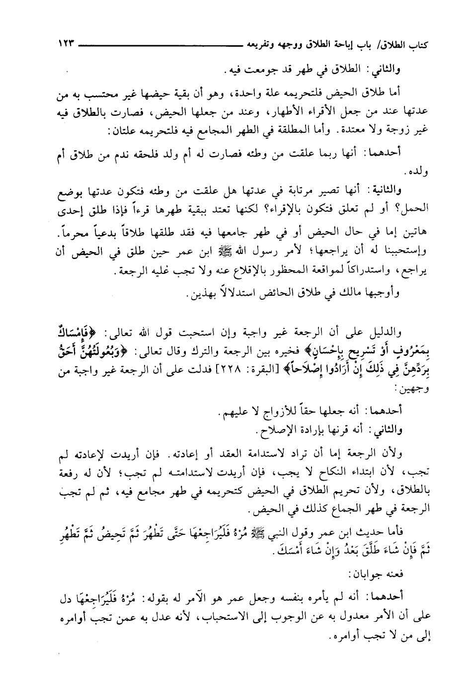 وَلِأَنَّ الرَّجْعَةَ إِمَّا أَنْ تُرَادَ لِاسْتِدَامَةِ الْعَقْدِ أَوْ إِعَادَتِهِ. فَإِنْ أُرِيدَتْ لِإِعَادَتِهِ لَمْ تَجِبْ، لِأَنَّ ابْتِدَاءَ النِّكَاحِ لَا يَجِبُ، فَإِنْ أُرِيدَتْ لِاسْتِدَامَتِهِ لَمْ تَجِبْ؛ لِأَنَّ لَهُ رَفْعَهُ بِالطَّلَاقِ، وَلِأَنَّ تَحْرِيمَ الطَّلَاقِ فِي الْحَيْضِ كَتَحْرِيمِهِ فِي طُهْرٍ مُجَامَعٍ فِيهِ، ثُمَّ لَمْ تَجِبِ الرَّجْعَةُ فِي طُهْرِ الْجِمَاعِ كَذَلِكَ فِي الْحَيْضِ.