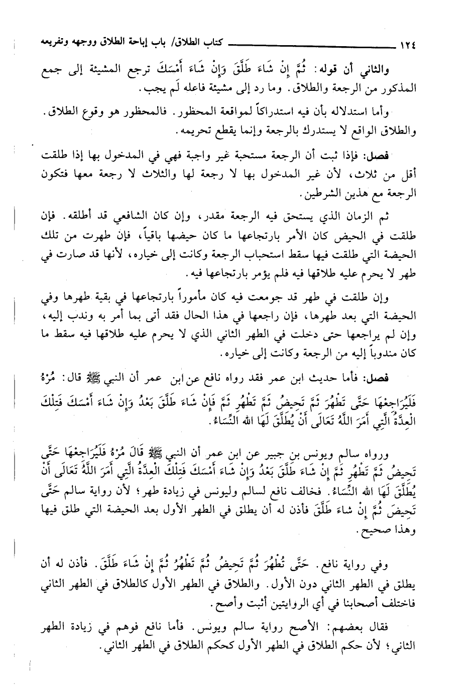 فَأَمَّا حَدِيثُ ابْنِ عُمَرَ فَقَدْ رَوَاهُ نَافِعٍ عَنِ ابْنِ عُمَرَ أَنَّ النَّبِيَّ - صَلَّى اللَّهُ عَلَيْهِ وَسَلَّم َ - قَالَ: مُرْهُ فَلَيُرَاجِعْهَا حَتَّى تَطْهُرَ ثُمَّ تَحِيضَ ثُمَّ تَطْهُرَ ثُمَّ فَإِنْ شَاءَ طَلَّقَ بَعْدُ وَإِنْ شَاءَ أَمْسَكَ فَتِلْكَ الْعِدَّةُ الَّتِي أَمَرَ اللَّهُ تَعَالَى أَنْ يُطْلَّقَ لها الله النِّسَاءُ.