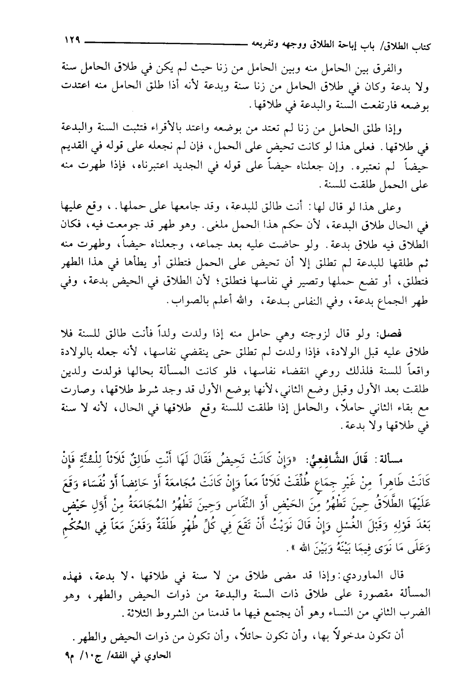 قَالَ الْمَاوَرْدِيُّ: وَإِذَا قَدْ مَضَى طَلَاقُ مَنْ لا سنة في طلاقها، لا بِدْعَةَ، فَهَذِهِ الْمَسْأَلَةُ مَقْصُورَةٌ عَلَى طَلَاقِ ذَاتِ السُّنَّةِ وَالْبِدْعَةِ مِنْ ذَوَاتِ الْحَيْضِ وَالطُّهْرِ، وَهُوَ الضَّرْبُ الثَّانِي مِنَ النِّسَاءِ وَهُوَ أَنْ يَجْتَمِعَ فِيهَا مَا قَدَّمْنَا مِنَ الشُّرُوطِ الثَّلَاثَةِ.