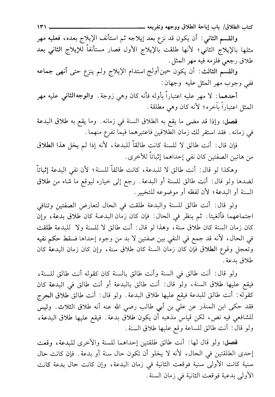 وَإِذَا قَدْ مَضَى مَا يقع به الطلاق السُّنَّةُ فِي زَمَانِهِ. وَمَا يَقَعُ بِهِ طَلَاقُ الْبِدْعَةِ فِي زَمَانِهِ. فَقَدِ اسْتَقَرَّ لَكَ زَمَانُ الطَّلَاقَيْنِ فَاعْتَبِرْهُمَا فِيمَا تَفَرَّعَ مِنْهُمَا.