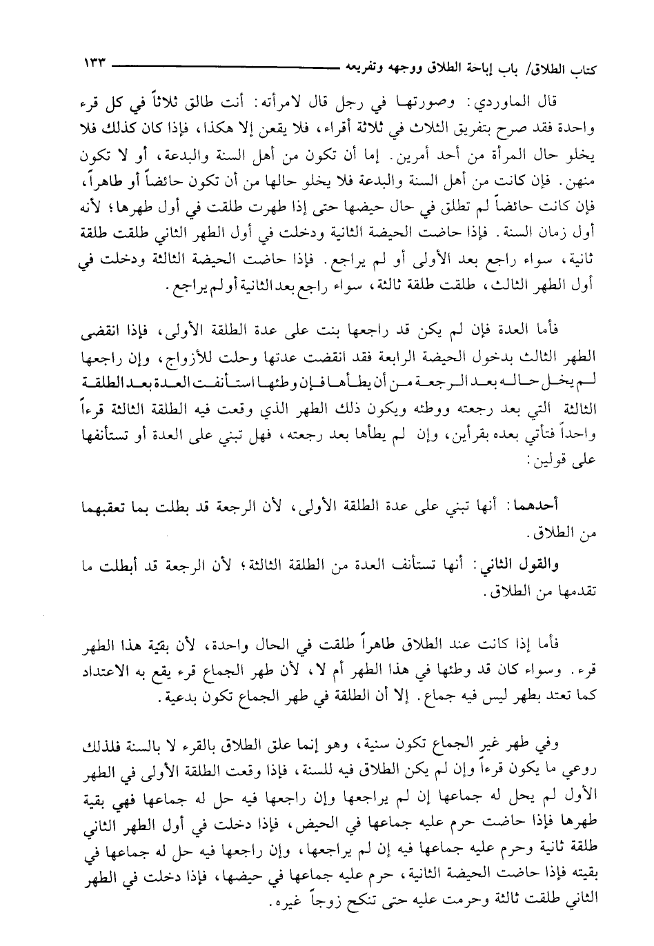 قَالَ الْمَاوَرْدِيُّ: وَصُورَتُهَا فِي رَجُلٍ قَالَ لِامْرَأَتِهِ: أَنْتِ طَالِقٌ ثَلَاثًا فِي كُلِّ قُرْءٍ وَاحِدَةٌ فَقَدْ صَرَّحَ بِتَفْرِيقِ الثَّلَاثِ فِي ثَلَاثَةِ أَقْرَاءٍ، فَلَا يَقَعْنَ إِلَّا هَكَذَا، فَإِذَا كَانَ كَذَلِكَ فَلَا يَخْلُو حَالُ الْمَرْأَةِ مِنْ أَحَدِ أَمْرَيْنِ. إِمَّا أَنْ تَكُونَ مِنْ أَهْلِ السُّنَّةِ وَالْبِدْعَةِ، أَوْ لَا تَكُونُ مِنْهُنَّ. فَإِنْ كَانَتْ مِنْ أَهْلِ السُّنَّةِ وَالْبِدْعَةِ فَلَا يَخْلُو حَالُهَا مِنْ أَنْ تَكُونَ حَائِضًا أَوْ طَاهِرًا، فَإِنْ كَانَتْ حَائِضًا لَمْ تُطَلَّقْ فِي حَالِ حَيْضِهَا حَتَّى إِذَا طَهُرَتْ طُلِّقَتْ فِي أَوَّلِ طُهْرِهَا؛ لِأَنَّهُ أَوَّلُ زَمَانِ السُّنَّةِ. فَإِذَا حَاضَتِ الْحَيْضَةَ الثَّانِيَةَ وَدَخَلَتْ فِي أَوَّلِ الطُّهْرِ الثَّانِي طُلِّقَتْ طَلْقَةً ثَانِيَةً، سَوَاءٌ رَاجَعَ بَعْدَ الْأُولَى أَوْ لَمْ يُرَاجِعْ. فَإِذَا حَاضَتِ الْحَيْضَةَ الثَّالِثَةَ وَدَخَلَتْ فِي أَوَّلِ الطُّهْرِ الثَّالِثِ، طُلِّقَتْ طَلْقَةً ثَالِثَةً، سَوَاءٌ رَاجَعَ بَعْدَ الثَّانِيَةِ أَوْ لَمْ يُرَاجِعْ.
