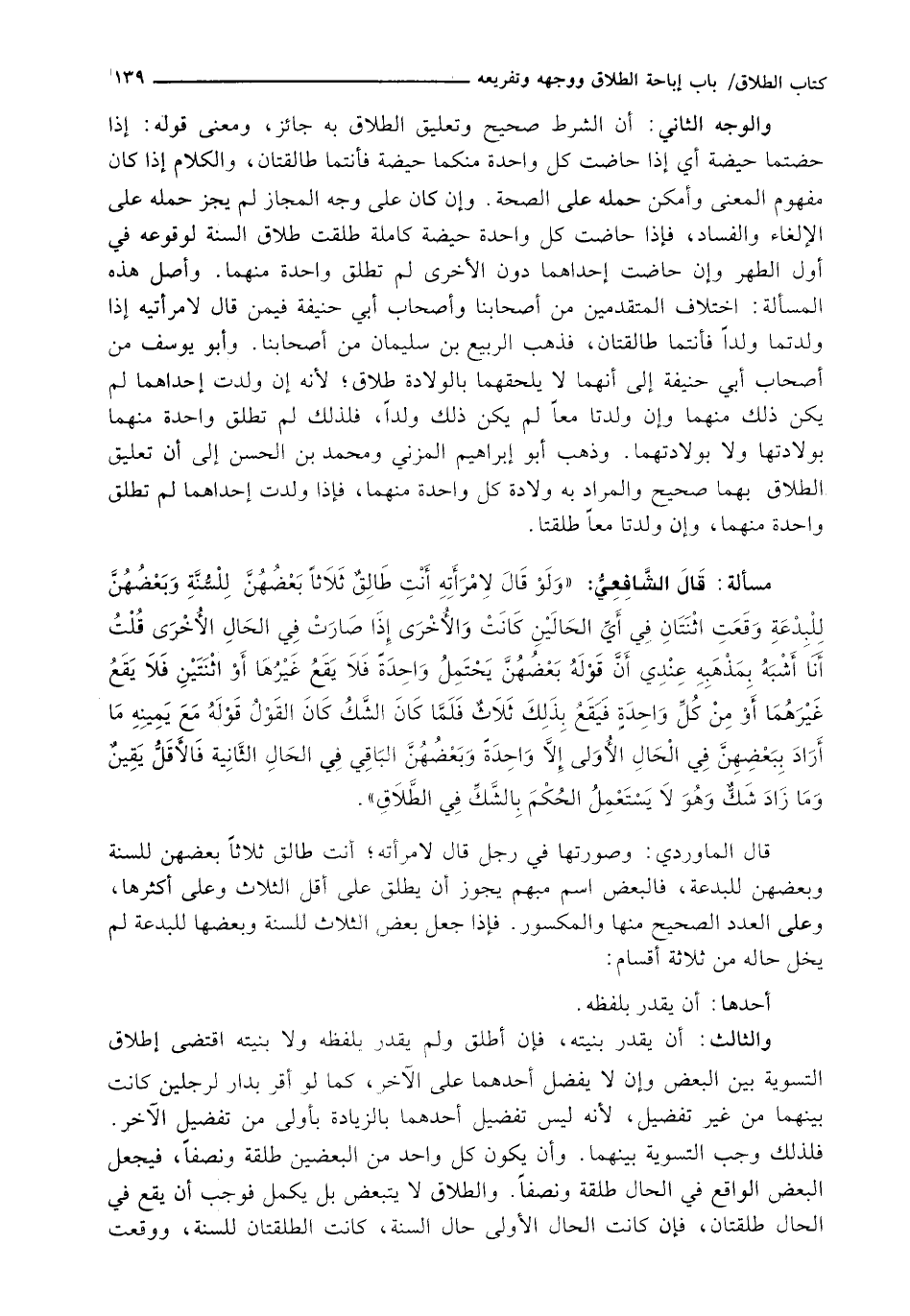 قال الشافعي: (وَلَوْ قَالَ لِامْرَأَتِهِ أَنْتِ طَالِقٌ ثَلَاثًا بَعْضُهُنَّ لِلسُّنَّةِ وَبَعْضُهُنَّ لِلْبِدْعَةِ وَقَعَتِ اثْنَتَانِ فِي أَيِّ الْحَالَيْنِ كَانَتْ وَالْأُخْرَى إِذَا صَارَتْ فِي الْحَالِ الأخرى قلت أنا أَشْبَهُ بِمَذْهَبِهِ عِنْدِي أَنَّ قَوْلَهُ بَعْضُهُنَّ يَحْتَمِلُ وَاحِدَةً فَلَا يَقَعُ غَيْرُهَا أَوِ اثْنَتَيْنِ فَلَا يَقَعُ غَيْرُهُمَا أَوْ مِنْ كُلِّ وَاحِدَةٍ فَيَقَعُ بِذَلِكَ ثَلَاثٌ فَلَمَّا كَانَ الشَكُّ كَانَ الْقَوْلُ قَوْلَهُ مَعَ يَمِينِهِ مَا أَرَادَ بِبَعْضِهِنَّ فِي الْحَالِ الْأُولَى إِلَّا وَاحِدَةً وَبَعْضُهُنَّ الْبَاقِي فِي الْحَالِ الثَّانِيَةِ فَالْأَقَلُّ يَقِينٌ وَمَا زَادَ شَكٌّ وَهُوَ لَا يَسْتَعْمِلُ الْحُكْمَ بِالشَكِّ فِي الطَّلَاقِ) .