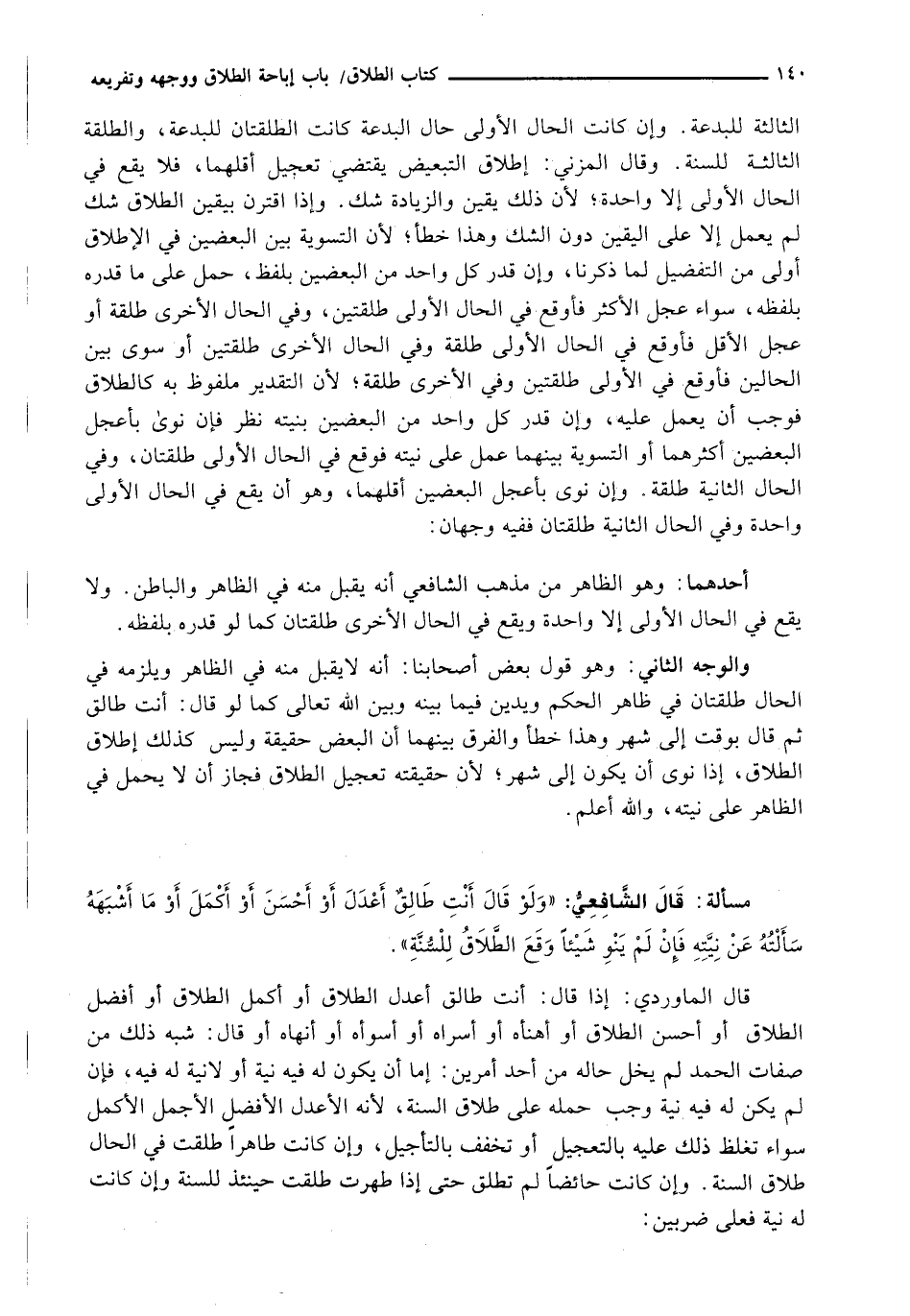 قَالَ الْمَاوَرْدِيُّ: إِذَا قَالَ: أَنْتِ طَالِقٌ أَعْدَلَ الطَّلَاقِ أَوْ أَكْمَلَ الطَّلَاقِ أَوْ أَفْضَلَ الطَّلَاقِ أَوْ أَحْسَنَ الطَّلَاقِ أَوْ أَهْنَأَهُ أَوْ أَسْرَاهُ أَوْ أَسْوَأَهُ أَوْ أَنْهَاهُ أَوْ قَالَ: شِبْهَ ذَلِكَ مِنْ صِفَاتِ الْحَمْدِ لَمْ يَخْلُ حَالُهُ مِنْ أَحَدِ أَمْرَيْنِ: إِمَّا أَنْ يَكُونَ لَهُ فِيهِ نِيَّةٌ أَوْ لَا نِيَّةَ لَهُ فِيهِ، فَإِنْ لَمْ يَكُنْ لَهُ فِيهِ نِيَّةٌ وَجَبَ حَمْلُهُ عَلَى طَلَاقِ السُّنَّةِ، لِأَنَّهُ الْأَعْدَلُ الْأَفْضَلُ الْأَجْمَلُ الْأَكْمَلُ سَوَاءٌ تَغَلَّظَ ذَلِكَ عَلَيْهِ بِالتَّعْجِيلِ أَوْ تَخَفَّفَ بِالتَّأْجِيلِ، وَإِنْ كَانَتْ طَاهِرًا طُلِّقَتْ فِي الْحَالِ طَلَاقَ السُّنَّةِ. وَإِنْ كَانَتْ حَائِضًا لَمْ تُطَلَّقْ حَتَّى إِذَا طَهُرَتْ طُلِّقَتْ حِينَئِذٍ لِلسُّنَّةِ وَإِنْ كَانَتْ لَهُ نِيَّةٌ فَعَلَى ضربين: