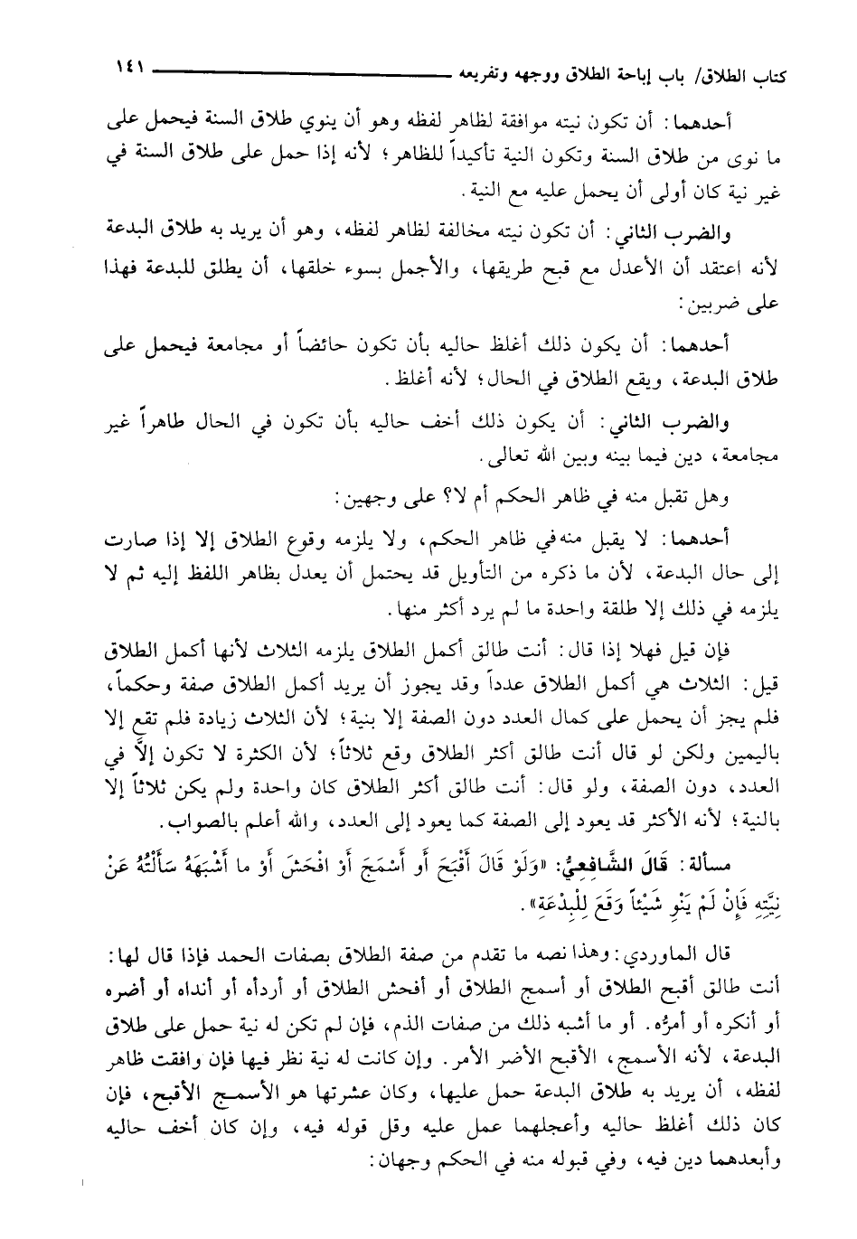قَالَ الْمَاوَرْدِيُّ: وهذا نَصُّهُ مَا تَقَدَّمَ مِنْ صِفَةِ الطَّلَاقِ بِصِفَاتِ الْحَمْدِ فَإِذَا قَالَ لَهَا: أَنْتِ طَالِقٌ أَقْبَحَ الطَّلَاقِ أَوْ أَسْمَجَ الطَّلَاقِ أَوْ أَفْحَشَ الطَّلَاقِ أَوْ أَرْدَأَهُ أَوْ أَنْدَاهُ أَوْ أَضَرَّهُ أَوْ أَنْكَرَهُ أَوْ أَمَرَّهُ. أَوْ مَا أَشْبَهَ ذَلِكَ مِنْ صِفَاتِ الذَّمِّ، فَإِنْ لَمْ تَكُنْ لَهُ نِيَّةٌ حُمِلَ عَلَى طَلَاقِ الْبِدْعَةِ، لِأَنَّهُ الْأَسْمَجُ، الْأَقْبَحُ الْأَضَرُّ الْأَمَرُّ. وَإِنْ كَانَتْ لَهُ نِيَّةٌ نُظِرَ فِيهَا فَإِنْ وَافَقَتْ ظَاهِرَ لَفْظِهِ، أَنْ يُرِيدَ بِهِ طَلَاقَ الْبِدْعَةِ حُمِلَ عَلَيْهَا، وَكَانَ عِشْرَتُهَا هُوَ الْأَسْمَجَ الْأَقْبَحَ، فَإِنْ كَانَ ذَلِكَ أغلظ حاليه وأعجلهما عمل عليه وقل قَوْلُهُ فِيهِ، وَإِنْ كَانَ أَخَفَّ حَالَيْهِ وَأَبْعَدَهُمَا دِينَ فِيهِ، وَفِي قَبُولِهِ مِنْهُ فِي الْحُكْمِ وجهان: