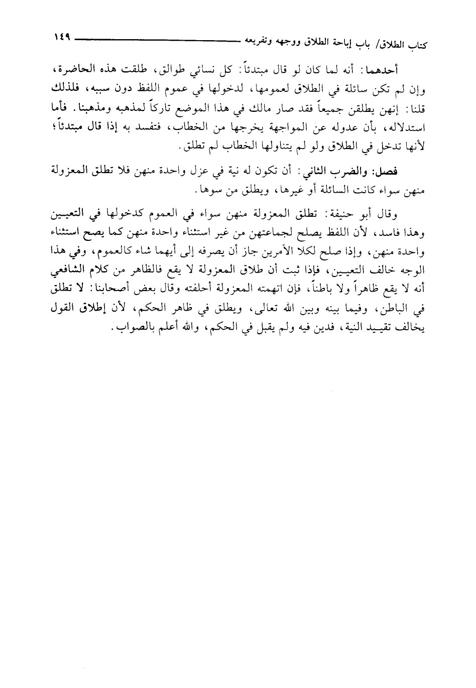 وَقَالَ أَبُو حَنِيفَةَ: تُطَلَّقُ الْمَعْزُولَةُ مِنْهُنَّ سَوَاءٌ فِي الْعُمُومِ كَدُخُولِهَا فِي التَّعْيِينِ وَهَذَا فَاسِدٌ، لِأَنَّ اللَّفْظَ يَصْلُحُ لِجَمَاعَتِهِنَّ مِنْ غَيْرِ اسْتِثْنَاءِ وَاحِدَةٍ مِنْهُنَّ كَمَا يَصِحُّ اسْتِثْنَاءُ وَاحِدَةٍ مِنْهُنَّ، وَإِذَا صَلُحَ لِكِلَا الْأَمْرَيْنِ جَازَ أَنْ يَصْرِفَهُ إِلَى أَيِّهِمَا شَاءَ كَالْعُمُومِ، وَفِي هَذَا الْوَجْهِ خَالَفَ التَّعْيِينَ، فَإِذَا ثَبَتَ أَنَّ طَلَاقَ الْمَعْزُولَةِ لَا يَقَعُ فَالظَّاهِرُ مِنْ كَلَامِ الشَّافِعِيِّ أَنَّهُ لَا يَقَعُ ظَاهِرًا وَلَا بَاطِنًا، فَإِنِ اتَّهَمَتْهُ الْمَعْزُولَةُ أَحْلَفْتُهُ وَقَالَ بَعْضُ أَصْحَابِنَا: لَا تُطَلَّقُ فِي الْبَاطِنِ، وَفِيمَا بَيْنَهُ وَبَيْنَ اللَّهِ تَعَالَى، ويطلق فِي ظَاهِرِ الْحُكْمِ، لِأَنَّ إِطْلَاقَ الْقَوْلِ يُخَالِفُ تَقْيِيدَ النِّيَّةِ، فَدِينَ فِيهِ وَلَمْ يُقْبَلْ فِي الْحُكْمِ، وَاللَّهُ أَعْلَمُ بِالصَّوَابِ.