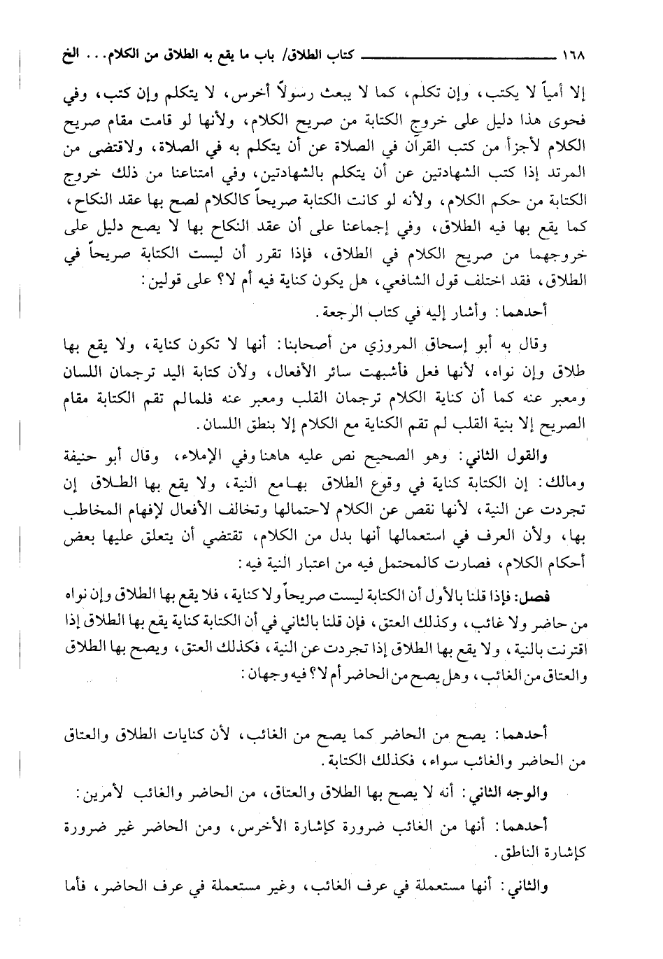 إِلَّا أُمِّيًّا لَا يَكْتُبُ، وَإِنْ تَكَلَّمَ، كَمَا لَا يَبْعَثُ رَسُولًا أَخْرَسَ، لَا يَتَكَلَّمُ وَإِنْ كتب، وفي فحوى هذا دليل على خروج الكتابة مِنْ صَرِيحِ الْكَلَامِ، وَلِأَنَّهَا لَوْ قَامَتْ مَقَامَ صَرِيحِ الْكَلَامِ لَأَجْزَأَ مِنْ كَتْبِ الْقُرْآنِ فِي الصَّلَاةِ عَنْ أَنْ يَتَكَلَّمَ بِهِ فِي الصَّلَاةِ، وَلَاقْتَضَى مِنَ الْمُرْتَدِّ إِذَا كَتَبَ الشَّهَادَتَيْنِ عَنْ أَنْ يَتَكَلَّمَ بِالشَّهَادَتَيْنِ، وَفِي امْتِنَاعِنَا مِنْ ذَلِكَ خُرُوجُ الْكِتَابَةِ مِنْ حُكْمِ الْكَلَامِ، وَلِأَنَّهُ لَوْ كَانَتِ الْكِتَابَةُ صَرِيحًا كَالْكَلَامِ لَصَحَّ بِهَا عَقْدُ النِّكَاحِ، كَمَا يَقَعُ بِهَا فِيهِ الطَّلَاقُ، وَفِي إِجْمَاعِنَا عَلَى أَنَّ عَقْدَ النِّكَاحِ بِهَا لَا يِصِحُّ دَلِيلٌ عَلَى خُرُوجِهِمَا مِنْ صَرِيحِ الْكَلَامِ فِي الطَّلَاقِ، فَإِذَا تَقَرَّرَ أَنْ لَيْسَتِ الْكِتَابَةُ صَرِيحًا فِي الطَّلَاقِ، فَقَدِ اخْتَلَفَ قَوْلُ الشَّافِعِيِّ، هَلْ يَكُونُ كِنَايَةً فِيهِ أَمْ لَا؟ عَلَى قَوْلَيْنِ: