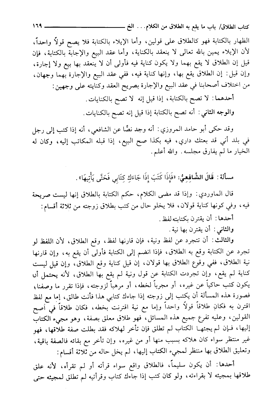قَالَ الماوردي: وإذا قد مضى الكلام، حُكْمُ الْكِتَابَةِ بِالطَّلَاقِ أَنَّهَا لَيْسَتْ صَرِيحَةً فِيهِ، وَفِي كَوْنِهَا كِنَايَةً قَوْلَانِ، فَلَا يَخْلُو حَالُ مَنْ كَتَبَ بِطَلَاقِ زَوْجَتِهِ مِنْ ثَلَاثَةِ أَقْسَامٍ: