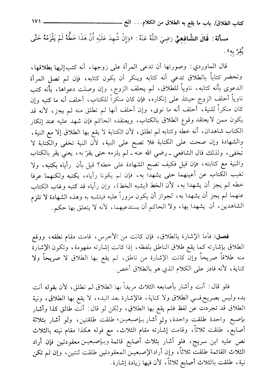 قَالَ الْمَاوَرْدِيُّ: وَصُورَتُهَا أَنْ تَدَّعِيَ الْمَرْأَةُ عَلَى زَوْجِهَا، أَنَّهُ كَتَبَ إليها بطلاقها، وتحضر كِتَابًا بِالطَّلَاقِ تَدَّعِي أَنَّهُ كِتَابُهُ وَيُنْكِرُ أَنْ يَكُونَ كِتَابَهُ، فَإِنْ لَمْ تَصِلِ الْمَرْأَةُ الدَّعْوَى بِأَنَّهُ كِتَابُهُ، نَاوِيًا لِلطَّلَاقِ، لَمْ يُحْلَفِ الزَّوْجُ، وَإِنْ وَصَلَتْ دَعْوَاهَا، بِأَنَّهُ كَتَبَ نَاوِيًا أُحْلِفَ الزَّوْجُ حِينَئِذٍ عَلَى إِنْكَارِهِ، فَإِنْ كَانَ مُنْكِرًا لِلْكِتَابِ، أُحْلِفَ أَنَّهُ مَا كَتَبَهُ وَإِنْ كَانَ مُنْكِرًا لِلنِّيَّةِ، أُحْلِفَ أَنَّهُ مَا نَوَى، وَإِنْ أُحْلِفَ أَنَّهَا لَمْ تُطَلَّقْ مِنْهُ لَمْ يَجُزْ، لِأَنَّهُ قَدْ يَكُونُ مِمَّنْ لَا يَعْتَقِدُ وُقُوعَ الطَّلَاقِ بِالْكِتَابِ، وَيَعْتَقِدُهُ الْحَاكِمُ فَإِنْ شَهِدَ عَلَيْهِ عِنْدَ إِنْكَارِ الْكِتَابِ شَاهِدَانِ، أَنَّهُ خَطُّهُ وَكِتَابُهُ لَمْ تُطَلَّقْ، لِأَنَّ الْكِتَابَةَ لَا يَقَعُ بِهَا الطَّلَاقُ إِلَّا مَعَ النِّيَّةِ، وَالشَّهَادَةُ وَإِنْ صَحَّتْ عَلَى الْكِتَابَةِ فَلَا تَصِحُّ عَلَى النِّيَّةِ، لِأَنَّ النِّيَّةَ تَخْفَى وَالْكِتَابَةَ لَا تَخْفَى، وَلِذَلِكَ قَالَ الشَّافِعِيُّ - رَضِيَ اللَّهُ عَنْهُ - لَمْ يَلْزَمْهُ حَتَّى يُقِرَّ بِهِ، يَعْنِي يُقِرُّ بِالْكِتَابِ وَالنِّيَّةِ مَعَ كِتَابَتِهِ، فَإِنْ قِيلَ فَكَيْفَ تَصِحُّ الشَّهَادَةُ عَلَى خطه؟ قيل بأن رأياه يكتبه، ولا تغيب الْكِتَابُ عَنْ أَعْيُنِهِمَا حَتَّى يَشْهَدَا بِهِ، فَإِنْ لَمْ يَكُونَا رَأَيَاهُ، يَكْتُبُهُ وَلَكِنَّهُمَا عَرَفَا خَطَّهُ لَمْ يَجُزْ أَنْ يَشْهَدَا بِهِ، لِأَنَّ الْخَطَّ (يشبه الخط) ، وَإِنْ رَأَيَاهُ قَدْ كَتَبَهُ وَغَابَ الْكِتَابُ عَنْهُمَا لَمْ يَجُزْ أَنْ يَشْهَدَا بِهِ، لِجَوَازِ أَنْ يَكُونَ مُزَوَّرًا عَلَيْهِ فَيَتَشَبَّهُ بِهِ وَهَذِهِ الشَّهَادَةُ لَا تَلْزَمُ الشَّاهِدَيْنِ، أَنْ يَشْهَدَا بِهَا، وَلَا الْحَاكِمَ أَنْ يَسْتَدْعِيَهُمَا، لِأَنَّهُ لَا يَتَعَلَّقُ بِهَا حُكْمٌ.