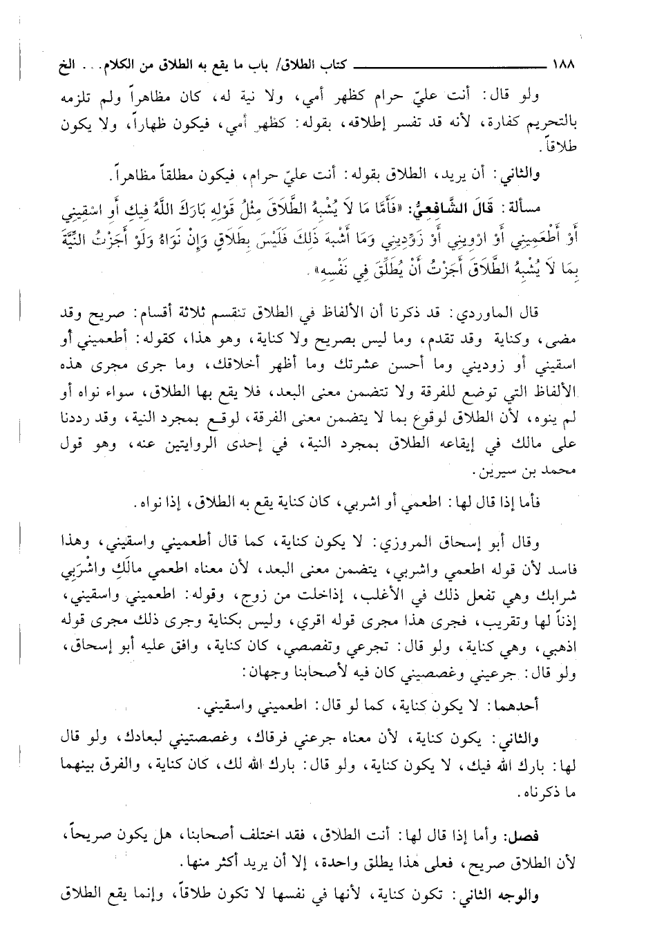 قَالَ الْمَاوَرْدِيُّ: قَدْ ذَكَرْنَا أَنَّ الْأَلْفَاظَ فِي الطَّلَاقِ تَنْقَسِمُ ثَلَاثَةَ أَقْسَامٍ: صَرِيحٌ وَقَدْ مَضَى، وَكِنَايَةٌ وَقَدْ تَقَدَّمَ، وَمَا لَيْسَ بِصَرِيحٍ وَلَا كِنَايَةٍ، وَهُوَ هَذَا، كَقَوْلِهِ: أَطْعِمِينِي أَوِ اسْقِينِي أَوْ زَوِّدِينِي وَمَا أَحْسَنَ عِشْرَتَكِ وَمَا أَظْهَرَ أَخْلَاقَكِ، وَمَا جَرَى مَجْرَى هَذِهِ الْأَلْفَاظِ الَّتِي تُوضَعُ لِلْفُرْقَةِ وَلَا تَتَضَمَّنُ مَعْنَى الْبُعْدِ، فَلَا يَقَعُ بِهَا الطَّلَاقُ، سَوَاءٌ نَوَاهُ أَوْ لَمْ يَنْوِهِ، لِأَنَّ الطَّلَاقَ لوقَوعَ بِمَا لا يتضمن معنى الفرقة، لوقع بِمُجَرَّدِ النِّيَّةِ، وَقَدْ رَدَدْنَا عَلَى مَالِكٍ فِي إِيقَاعِهِ الطَّلَاقَ بِمُجَرَّدِ النِّيَّةِ، فِي إِحْدَى الرِّوَايَتَيْنِ عَنْهُ، وَهُوَ قَوْلُ مُحَمَّدِ بْنِ سِيرِينَ.