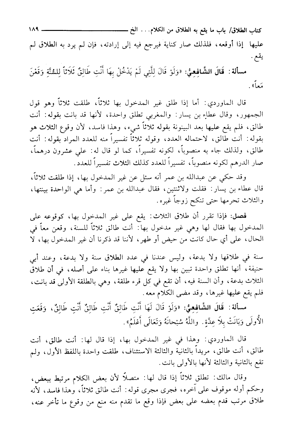 قَالَ الْمَاوَرْدِيُّ: أَمَّا إِذَا طَلَّقَ غَيْرَ الْمَدْخُولِ بِهَا ثَلَاثًا، طُلِّقَتْ ثَلَاثًا وَهُوَ قَوْلُ الْجُمْهُورِ، وَقَالَ عَطَاءُ بْنُ يَسَارٍ: وَالْمَغْرِبِيُّ تُطَلَّقُ وَاحِدَةً، لِأَنَّهَا قَدْ بَانَتْ بِقَوْلِهِ: أَنْتِ طَالِقٌ، فَلَمْ يَقَعْ عَلَيْهَا بَعْدَ الْبَيْنُونَةِ بِقَوْلِهِ ثَلَاثًا شَيْءٌ، وَهَذَا فَاسِدٌ، لِأَنَّ وُقُوعَ الثَّلَاثِ هُوَ بِقَوْلِهِ: أَنْتِ طَالِقٌ، لِاحْتِمَالِهِ الْعَدَدَ، وَقَوْلُهُ ثَلَاثًا تَفْسِيرًا مِنْهُ لِلْعَدَدِ الْمُرَادِ بِقَوْلِهِ: أَنْتِ طَالِقٌ، وَلِذَلِكَ جَاءَ بِهِ مَنْصُوبًا، لِكَوْنِهِ تَفْسِيرًا، كَمَا لَوْ قَالَ لَهُ: عَلَيَّ عِشْرُونَ دِرْهَمًا، صَارَ الدِّرْهَمُ لِكَوْنِهِ مَنْصُوبًا، تَفْسِيرًا لِلْعَدَدِ كَذَلِكَ الثَّلَاثُ تَفْسِيرا لِلْعَدَدِ.