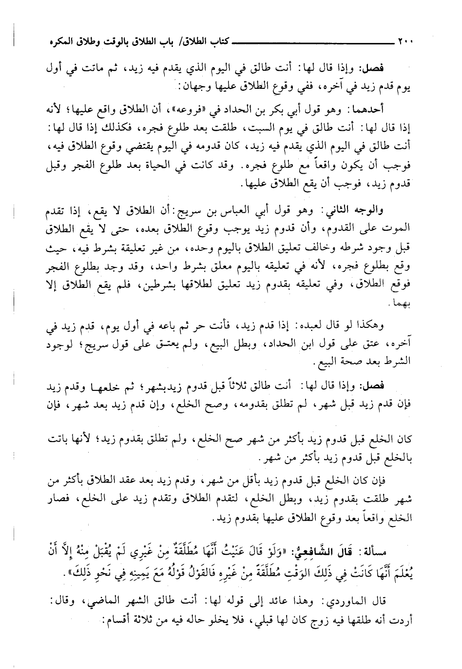 وَالْوَجْهُ الثَّانِي: وَهُوَ قَوْلُ أَبِي الْعَبَّاسِ بْنِ سُرَيْجٍ: أَنَّ الطَّلَاقَ لَا يَقَعُ، إِذَا تَقَدَّمَ الْمَوْتُ عَلَى الْقُدُومِ، وَأَنَّ قُدُومَ زَيْدٍ يُوجِبُ وُقُوعَ الطَّلَاقِ بَعْدَهُ، حَتَّى لَا يَقَعَ الطَّلَاقُ قَبْلَ وُجُودِ شَرْطِهِ وَخَالَفَ تَعْلِيقَ الطَّلَاقِ بِالْيَوْمِ وَحْدَهُ، مِنْ غَيْرِ تَعْلِيقِهِ بِشَرْطٍ فِيهِ، حَيْثُ وَقَعَ بِطُلُوعِ فَجْرِهِ، لِأَنَّهُ فِي تَعْلِيقِهِ بِالْيَوْمِ مُعَلَّقٌ بِشَرْطٍ وَاحِدٍ، وَقَدْ وُجِدَ بِطُلُوعِ الْفَجْرِ فَوَقَعَ الطَّلَاقُ، وَفِي تَعْلِيقِهِ بِقُدُومِ زَيْدٍ تَعْلِيقٌ لِطَلَاقِهَا بِشَرْطَيْنِ، فَلَمْ يَقَعِ الطَّلَاقُ إِلَّا بِهِمَا.