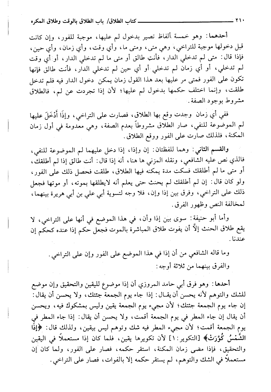 أَحَدُهَا: وَهُوَ فَرْقُ أَبِي حَامِدٍ الْمَرْوَزِيِّ أَنَّ إذا موضوع لليقين والتحقيق وإن مَوْضِعٌ لِلشَّكِّ وَالتَّوَهُّمِ لِأَنَّهُ يَحْسُنُ أَنْ يُقَالَ: إِذَا جَاءَ يَوْمُ الْجُمُعَةِ جِئْتُكَ، وَلَا يَحْسُنُ أَنْ يُقَالَ: إِنْ جَاءَ يَوْمُ الْجُمُعَةِ جِئْتُكَ؛ لِأَنَّ مَجِيءَ يَوْمِ الْجُمُعَةِ يَقِينٌ وَلَيْسَ بِمَشْكُوكٍ فِيهِ، وَيَحْسُنُ أَنْ يُقَالَ إِنْ جَاءَ الْمَطَرُ فِي يَوْمِ الْجُمُعَةِ أَقَمْتُ، وَلَا يَحْسُنُ أَنْ يُقَالَ: إِذَا جَاءَ الْمَطَرُ فِي يَوْمِ الْجُمُعَةِ أَقَمْتُ؛ لِأَنَّ مَجِيءَ الْمَطَرِ فِيهِ شَكٌّ وَتَوَهُّمٌ لَيْسَ بِيَقِينٍ، وَلِذَلِكَ قَالَ: {إِذَا الشَّمْسُ كُوِّرَتْ} [التكوير: 1] لِأَنَّ تَكْوِيرَهَا يَقِينٌ، فَلَمَّا كَانَ إِذَا مُسْتَعْمَلًا فِي الْيَقِينِ وَالتَّحْقِيقِ، فَإِذَا مَضَى زَمَانُ الْمُكْنَةِ، اسْتَقَرَّ حُكْمُهُ، فَصَارَ عَلَى الْفَوْرِ، وَلَمَّا كَانَ إِنْ مُسْتَعْمَلًا فِي الشَّكِّ وَالتَّوَهُّمِ، لَمْ يَسْتَقِرَّ حُكْمُهُ إِلَّا بِالْفَوَاتِ، فَصَارَ عَلَى التَّرَاخِي.