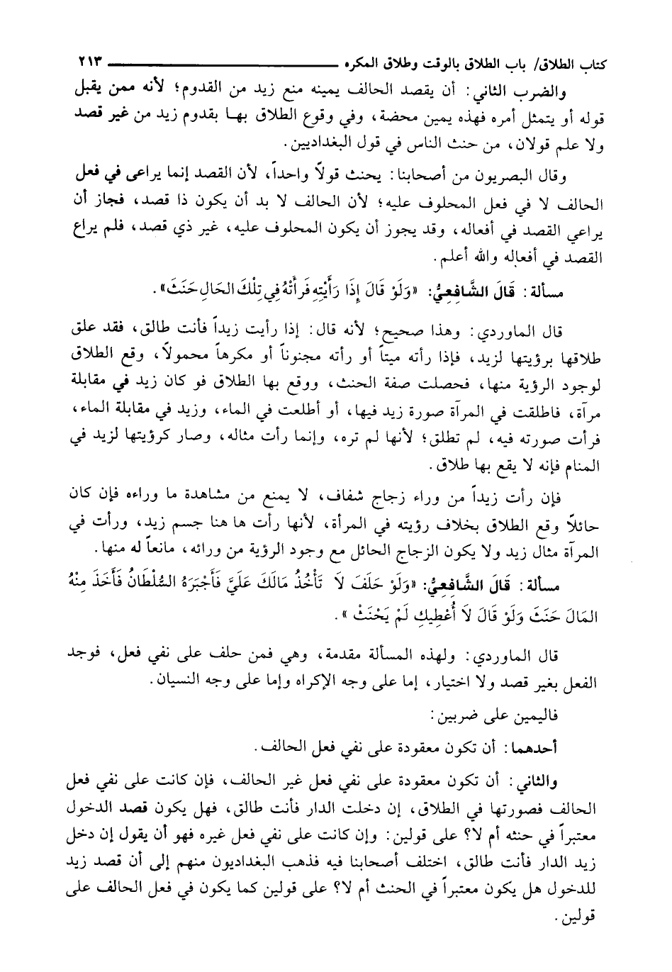 قَالَ الْمَاوَرْدِيُّ: وَهَذَا صَحِيحٌ؛ لِأَنَّهُ قَالَ: إِذَا رَأَيْتِ زَيْدًا فَأَنْتِ طَالِقٌ، فَقَدْ عَلَّقَ طَلَاقَهَا بِرُؤْيَتِهَا لِزَيْدٍ، فَإِذَا رَأَتْهُ مَيِّتًا أَوْ رَأَتْهُ مَجْنُونًا أَوْ مُكْرَهًا مَحْمُولًا، وَقَعَ الطَّلَاقُ لِوُجُودِ الرُّؤْيَةِ مِنْهَا، فَحَصَلَتْ صِفَةُ الْحِنْثِ، وَوَقَعَ بِهَا الطَّلَاقُ فَلَوْ كَانَ زيد في مقابلة مرآة، فاطلقت فِي الْمِرْآةِ صُورَةُ زَيْدٍ فِيهَا، أَوِ اطَّلَعَتْ فِي الْمَاءِ، وَزَيْدٌ فِي مُقَابَلَةِ الْمَاءِ، فَرَأَتْ صُورَتَهُ فِيهِ، لَمْ تُطَلَّقْ؛ لِأَنَّهَا لَمْ تَرَهُ، وَإِنَّمَا رَأَتْ مِثَالَهُ، وَصَارَ كَرُؤْيَتِهَا لِزَيْدٍ فِي الْمَنَامِ فَإِنَّهُ لَا يَقَعُ بِهَا طَلَاقٌ.