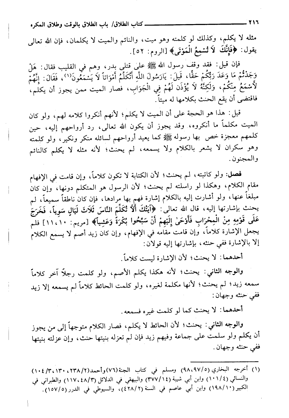 فَإِنْ قِيلَ: فَقَدْ وَقَفَ رَسُولُ اللَّهِ - صَلَّى اللَّهُ عَلَيْهِ وَسَلَّم َ - عَلَى قَتْلَى بَدْرٍ، وَهُمْ فِي الْقَلِيبِ فَقَالَ: هَلْ وَجَدْتُمْ مَا وَعَدَ رَبُّكُمْ حَقًّا، قَيْلَ: يَا رَسُولَ اللَّهِ أَتُكَلِّمُ أَمْوَاتًا لَا يَسْمَعُونَ، فَقَالَ: إِنَّهُمْ لَأَسْمَعُ مِنْكُمْ، وَلَكِنَّهُ لَا يُؤْذَنُ لَهُمْ فِي الْجَوَابِ، فَصَارَ الْمَيِّتُ مِمَّنْ يَجُوزُ أَنْ يُكَلَّمَ، فَاقْتَضَى أَنْ يَقَعَ الْحِنْثُ بِكَلَامِهَا لَهُ مَيِّتًا.