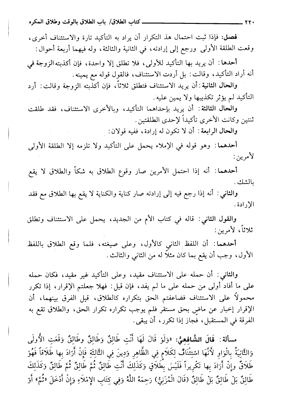 وَالْحَالُ الثَّالِثَةُ: أَنْ يُرِيدَ بِإِحْدَاهُمَا التَّأْكِيدَ، وَبِالْأُخْرَى الِاسْتِئْنَافَ، فَقَدْ طُلِّقَتْ ثِنْتَيْنِ وَكَانَتِ الْأُخْرَى تَأْكِيدًا لِإِحْدَى الطَّلْقَتَيْنِ. وَالْحَالُ الرَّابِعَةُ: أَنْ لَا تَكُونَ لَهُ إِرَادَةٌ، فَفِيهِ قَوْلَانِ: أَحَدُهُمَا: وَهُوَ قَوْلُهُ فِي الْإِمْلَاءِ يُحْمَلُ عَلَى التَّأْكِيدِ وَلَا تَلْزَمُهُ إِلَّا الطَّلْقَةُ الْأُولَى لِأَمْرَيْنِ: أَحَدُهُمَا: أَنَّهُ إِذَا احْتَمَلَ الْأَمْرَيْنِ صَارَ وُقُوعُ الطَّلَاقِ بِهِ شَكًّا وَالطَّلَاقُ لَا يَقَعُ بِالشَّكِّ.