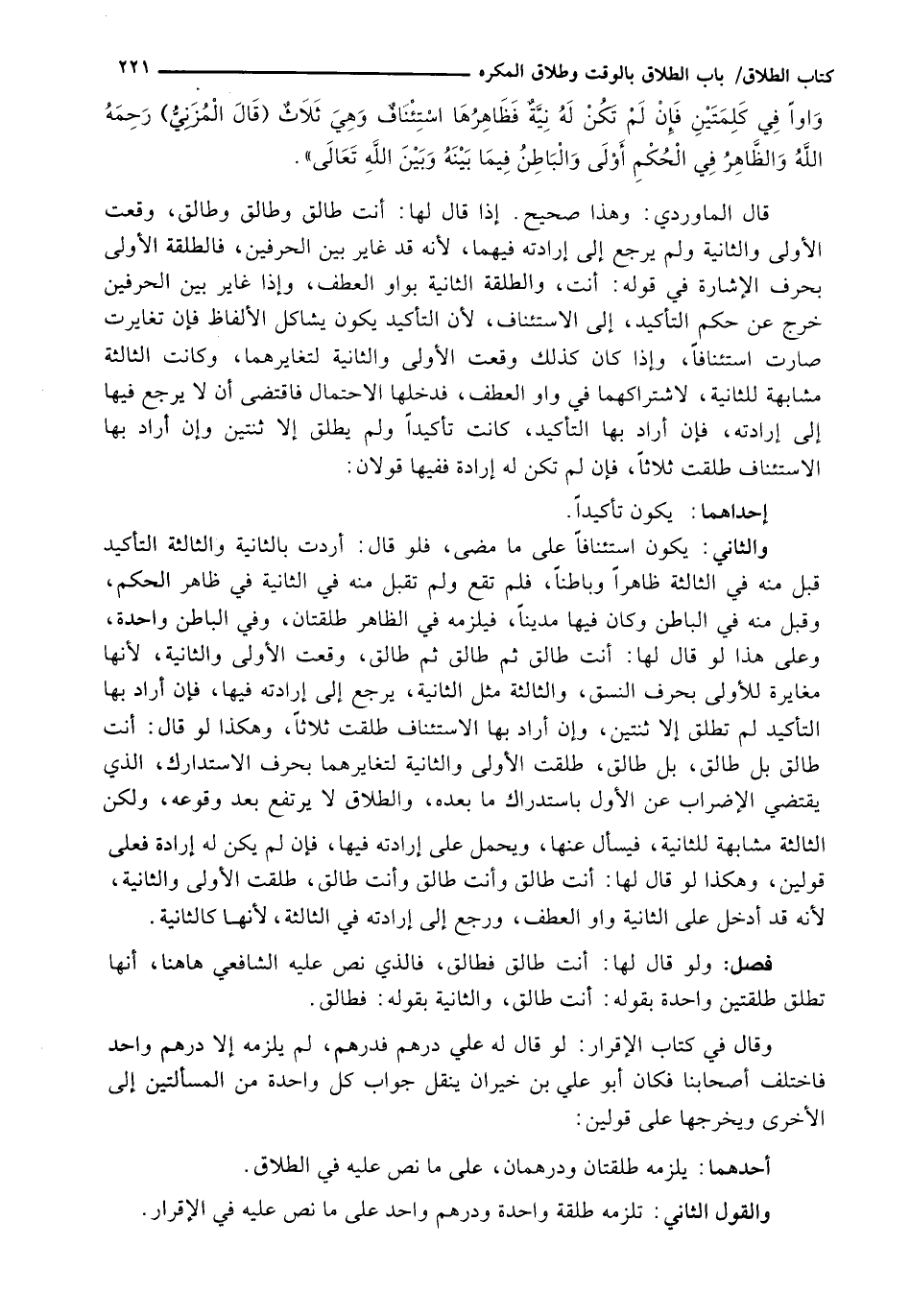 قَالَ الْمَاوَرْدِيُّ: وَهَذَا صَحِيحٌ. إِذَا قَالَ لَهَا: أَنْتِ طَالِقٌ وَطَالِقٌ وَطَالِقٌ، وَقَعَتِ الْأُولَى وَالثَّانِيَةُ وَلَمْ يُرْجَعْ إِلَى إِرَادَتِهِ فِيهِمَا، لِأَنَّهُ قَدْ غَايَرَ بَيْنَ الْحَرْفَيْنِ، فَالطَّلْقَةُ الْأُولَى بِحَرْفِ الْإِشَارَةِ فِي قَوْلِهِ: أَنْتِ، وَالطَّلْقَةُ الثَّانِيَةُ بِوَاوِ الْعَطْفِ، وَإِذَا غَايَرَ بَيْنَ الْحَرْفَيْنِ خَرَجَ عَنْ حُكْمِ التأكيد، إلى الاستئناف، لأن التأكيد يكون يشاكل الْأَلْفَاظَ فَإِنْ تَغَايَرَتْ صَارَتِ اسْتِئْنَافًا، وَإِذَا كَانَ كَذَلِكَ وَقَعَتِ الْأُولَى وَالثَّانِيَةُ لِتَغَايُرِهِمَا، وَكَانَتِ الثَّالِثَةُ مُشَابِهَةً لِلثَّانِيَةِ، لِاشْتِرَاكِهِمَا فِي وَاوِ الْعَطْفِ، فَدَخَلَهَا الِاحْتِمَالُ فَاقْتَضَى أَنْ لَا يُرْجَعَ فِيهَا إِلَى إِرَادَتِهِ، فَإِنْ أَرَادَ بِهَا التَّأْكِيدَ، كَانَتْ تَأْكِيدًا وَلَمْ يُطَلِّقْ إِلَّا ثِنْتَيْنِ وَإِنْ أَرَادَ بِهَا الِاسْتِئْنَافَ طُلِّقَتْ ثَلَاثًا، فَإِنْ لَمْ تَكُنْ لَهُ إرادة ففيها قولان: