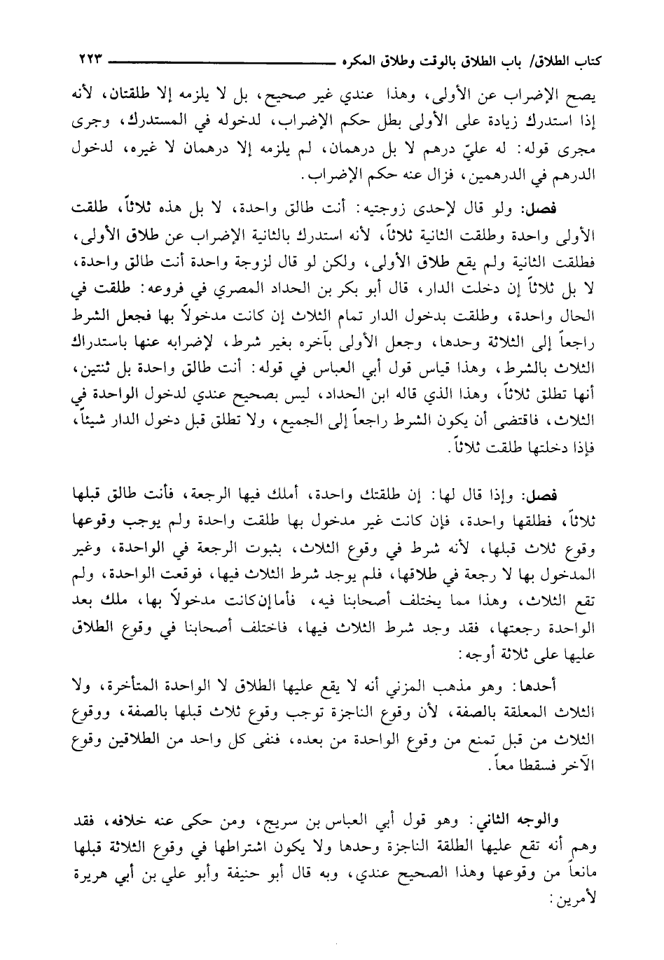وَلَوْ قَالَ لِإِحْدَى زَوْجَتَيْهِ: أَنْتِ طَالِقٌ وَاحِدَةً، لَا بَلْ هَذِهِ ثَلَاثًا، طُلِّقَتِ الْأُولَى وَاحِدَةً وَطُلِّقَتِ الثَّانِيَةُ ثَلَاثًا، لِأَنَّهُ اسْتَدْرَكَ بِالثَّانِيَةِ الْإِضْرَابَ عَنْ طَلَاقِ الْأُولَى، فَطُلِّقَتِ الثَّانِيَةُ وَلَمْ يَقَعْ طَلَاقُ الْأُولَى، وَلَكِنْ لَوْ قَالَ لِزَوْجَةٍ وَاحِدَةٍ أَنْتِ طَالِقٌ وَاحِدَةً، لَا بَلْ ثَلَاثًا إِنْ دَخَلْتِ الدَّارَ، قَالَ أَبُو بَكْرِ بْنُ الْحَدَّادِ الْمِصْرِيُّ فِي فُرُوعِهِ: طُلِّقَتْ فِي الْحَالِ وَاحِدَةً، وَطُلِّقَتْ بِدُخُولِ الدَّارِ تَمَامَ الثَّلَاثِ إِنْ كَانَتْ مَدْخُولًا بِهَا فَجَعَلَ الشَّرْطَ رَاجِعًا إِلَى الثَّلَاثَةِ وَحْدَهَا، وَجَعَلَ الْأُولَى بِآخِرِهِ بِغَيْرِ شَرْطٍ، لِإِضْرَابِهِ عَنْهَا بِاسْتِدْرَاكِ الثَّلَاثِ بِالشَّرْطِ، وَهَذَا قِيَاسُ قَوْلِ أَبِي الْعَبَّاسِ فِي قَوْلِهِ: أَنْتِ طَالِقٌ وَاحِدَةً بَلْ ثِنْتَيْنِ، أَنَّهَا تُطَلَّقُ ثَلَاثًا، وَهَذَا الَّذِي قَالَهُ ابْنُ الْحَدَّادِ، لَيْسَ بِصَحِيحٍ عِنْدِي لِدُخُولِ الْوَاحِدَةِ فِي الثَّلَاثِ، فَاقْتَضَى أَنْ يَكُونَ الشَّرْطُ رَاجِعًا إِلَى الْجَمِيعِ، وَلَا تُطَلَّقُ قَبْلَ دُخُولِ الدَّارِ شَيْئًا، فَإِذَا دَخَلَتْهَا طُلِّقَتْ ثَلَاثًا.