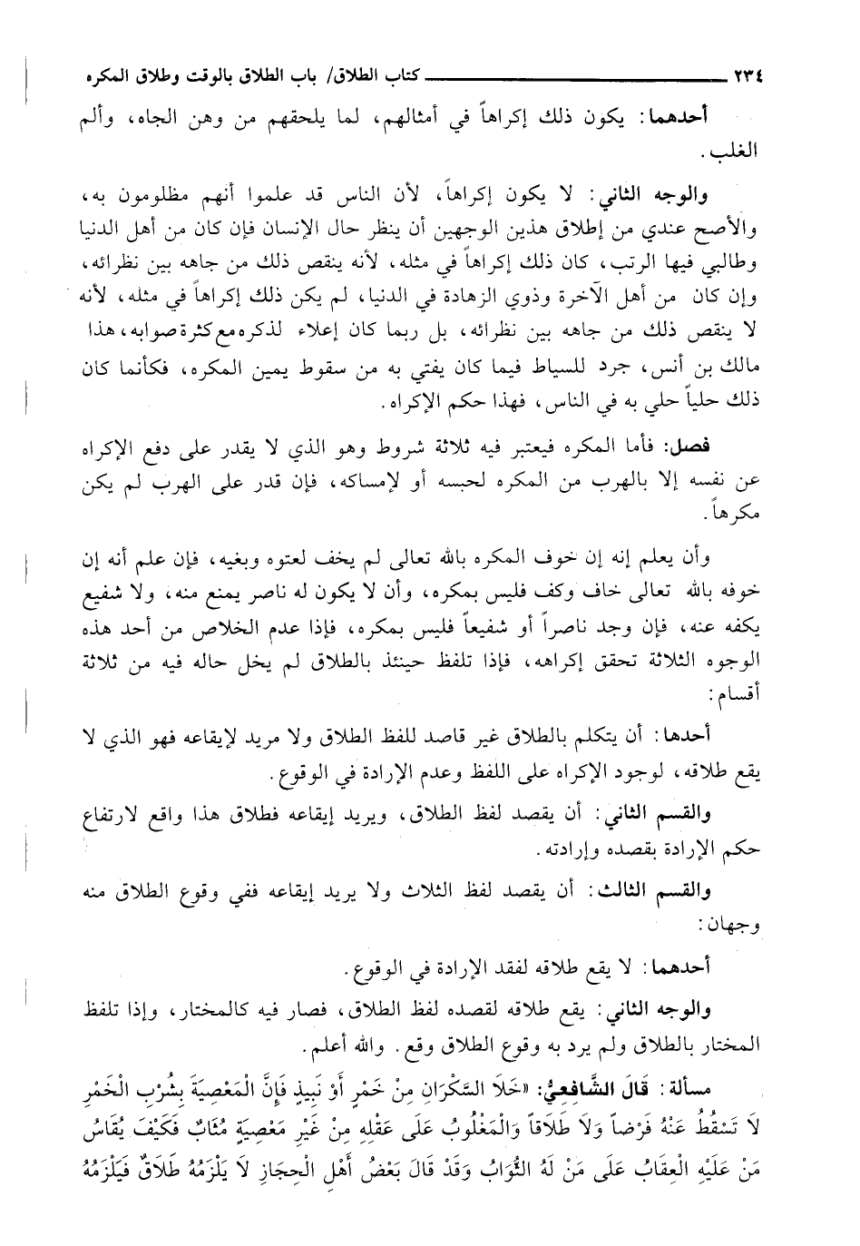 قال الشافعي: (خَلَا السَّكْرَانَ مِنْ خَمْرٍ أَوْ نَبِيذٍ فَإِنَّ الْمَعْصِيَةَ بِشُرْبِ الْخَمْرِ لَا تُسْقِطُ عَنْهُ فَرْضًا وَلَا طَلَاقًا وَالْمَغْلُوبُ عَلَى عَقْلِهِ مِنْ غَيْرِ مَعْصِيَةٍ مُثَابٌ فَكَيْفَ يُقَاسُ مَنْ عَلَيْهِ الْعِقَابُ على من له الثواب وقد قال بعض أهل الحجاز لا يلزمه طلاق فيلزمه