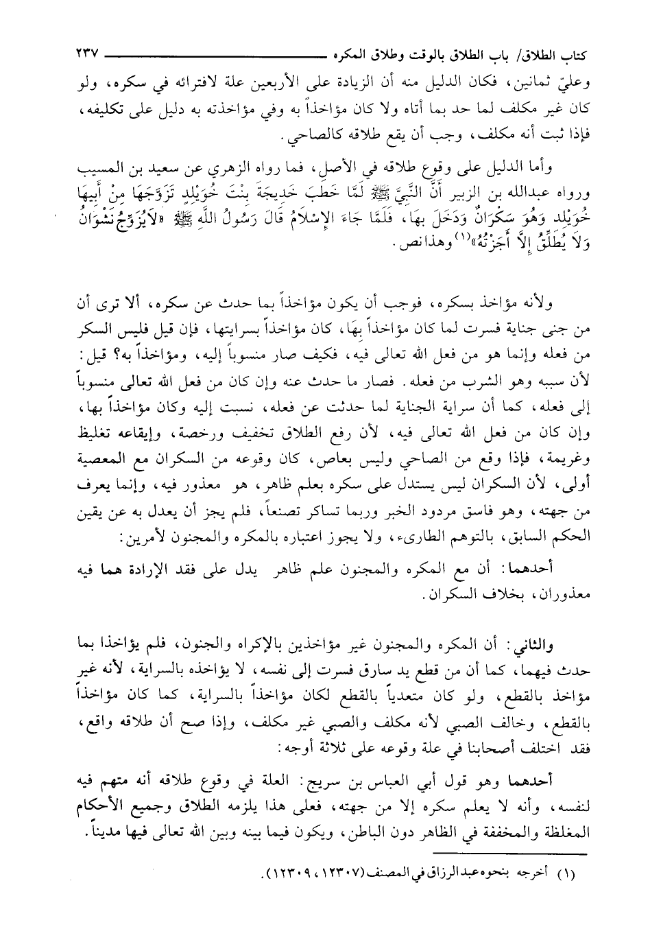 وَعَلِيٌّ ثَمَانِينَ، فَكَانَ الدَّلِيلُ مِنْهُ أَنَّ الزِّيَادَةَ عَلَى الْأَرْبَعِينَ عِلَّةٌ لِافْتِرَائِهِ فِي سُكْرِهِ، وَلَوْ كَانَ غَيْرَ مُكَلَّفٍ لَمَا حُدَّ بِمَا أَتَاهُ وَلَا كَانَ مُؤَاخَذًا بِهِ وَفِي مُؤَاخَذَتِهِ بِهِ دَلِيلٌ عَلَى تَكْلِيفِهِ، فَإِذَا ثَبَتَ أَنَّهُ مُكَلَّفٌ، وَجَبَ أَنْ يَقَعَ طَلَاقُهُ كَالصَّاحِي. وَأَمَّا الدَّلِيلُ عَلَى وُقُوعِ طَلَاقِهِ فِي الْأَصْلِ، فَمَا رَوَاهُ الزُّهْرِيُّ عَنْ سَعِيدِ بْنِ الْمُسَيَّبِ وَرَوَاهُ عَبْدُ اللَّهِ بْنُ الزُّبَيْرِ أَنَّ النَّبِيَّ - صَلَّى اللَّهُ عَلَيْهِ وَسَلَّم َ - لَمَّا خَطَبَ خَدِيجَةَ بِنْتَ خُوَيْلِدٍ تَزَوَّجَهَا مِنْ أَبِيهَا خُوَيْلِدٍ وَهُوَ سَكْرَانُ وَدَخَلَ بِهَا، فَلَمَّا جَاءَ الْإِسْلَامُ قَالَ رَسُولُ اللَّهِ - صَلَّى اللَّهُ عَلَيْهِ وَسَلَّم َ - (لَا يُزَوِّجُ نَشْوَانُ وَلَا يُطَلِّقُ إِلَّا أَجَزْتُهُ) وَهَذَا نَصٌّ.