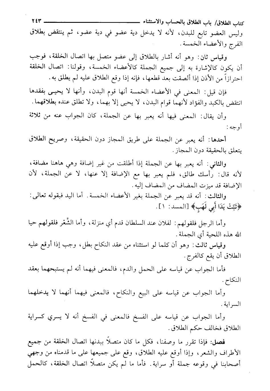 وَأَمَّا الْجَوَابُ عَنْ قِيَاسِهِ عَلَى الْبَيْعِ وَالنِّكَاحِ، فَالْمَعْنَى فِيهِمَا أَنَّهُمَا لَا يَدْخُلُهُمَا السَّرَايَةُ.
